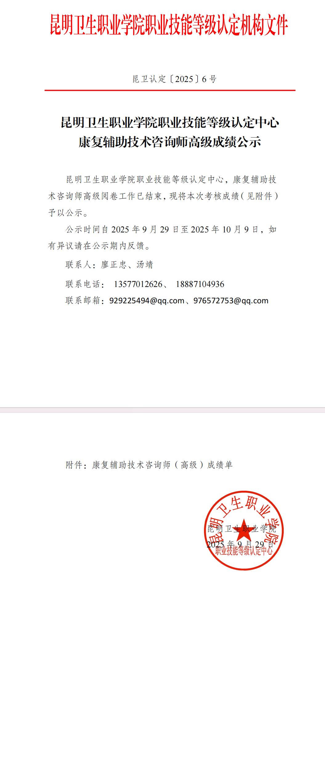 昆卫认定2025-6号文件-康复辅助技术咨询师(高级成绩公示)