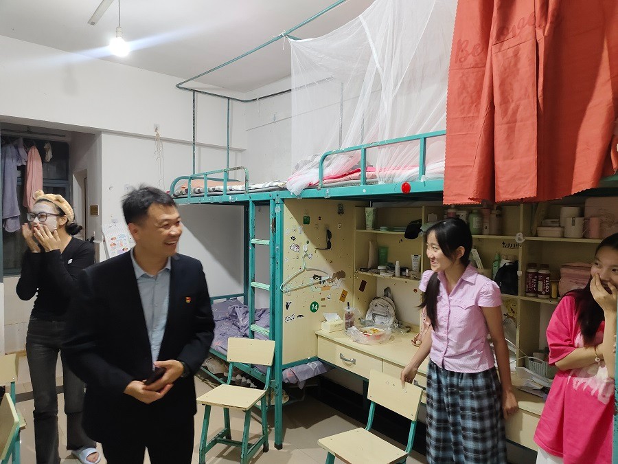 为深入了解2025级新生入住情况,帮助新生快速适应校园生活,8月30日晚,口腔学院直属党支部书记骆毅、口腔学院院长虎志辉、副院长张晓刚及学生管理负责人陈振军带领各级领导成员及全体辅导员,分别前往男生宿舍2栋与女生宿舍7栋,开展新生宿舍走访慰问工作。