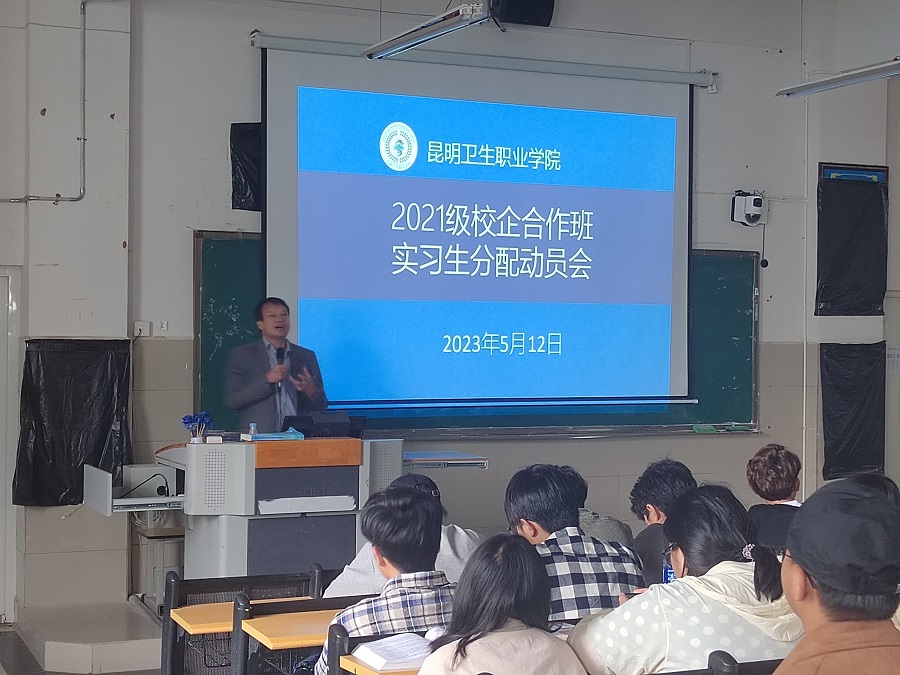 于5月12日口腔学院针对校企合作试点班2021级3.4班同学进行实习前校企合作单位实习生选拔动员会议,邀请了与学院多年合作的昆明硕博口腔保健知识咨询有限公司董事长赵青副主任医,口腔学院骆毅书记、张晓刚副院长、辅导员王晓丽老师参与动员会议。