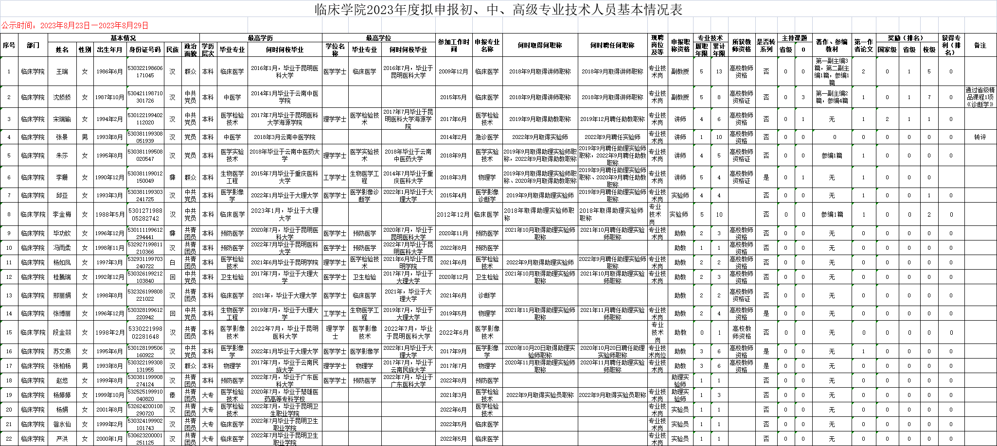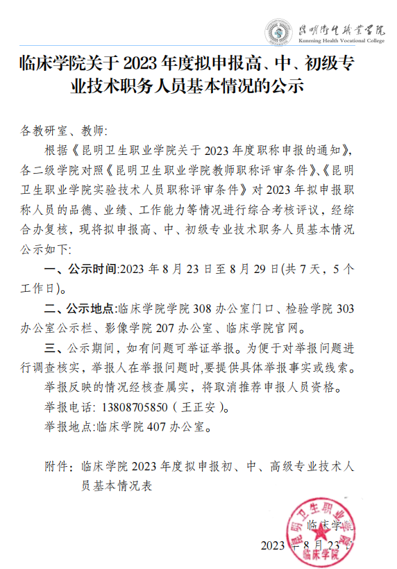 临床学院关于2023年度拟申报高、中、初级专业技术职务人员基本情况的公示