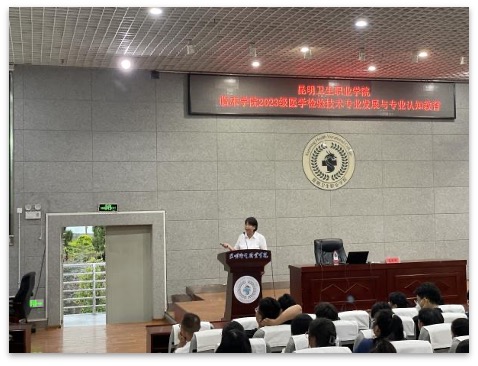 首先,张院长对2023级医学检验技术专业的新生的到来表示热烈的欢迎和祝贺。通过对专业概况、就业方向和趋势、未来目标、大学计划等方面的介绍,着重讲解了医学检验技术专业现状及学院在学生特色培养方面的思路以及学生职业发展的方向选择。使学生对于专业和未来三年的学习有了更清晰的规划。张院长希望同学们严格遵守学院的各项纪律,刻苦学习,努力参加专业各项技能大赛,希望同学们尽快的找到适合自己的学习方法,学会适应大学的学习和生活,给自己做出一个好的规划,为人生目标做个定位。最后,本次讲座在同学们激情高昂的医学生誓言中结束。