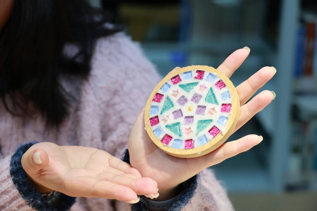 在 DIY 杯垫制作区,党员教师带头示范,与工会小组教职工携手合作。大家发挥创意,将材料巧妙搭配,在杯垫上勾勒出端各种图案。从设计构思到成品呈现,党员与教职工相互交流、互帮互助,不仅诞生了一个个独具匠心的杯垫作品,更在互动中强化了党建引领下的团队协作精神。
