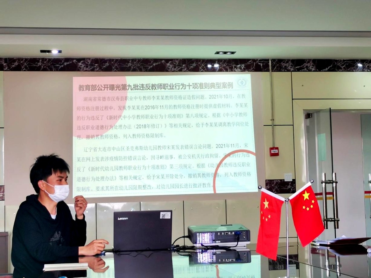 接下来,思政教师杨兴斌带领大家进行师德师风典型案例专题学习。杨老师围绕习近平总书记关于教育和师德师风的重要论述,通过重温《新时代高校教师职业行为十项准则》的内容、分享时代楷模黄大年先进事迹和违反教师职业行为十项准则典型案例,进一步强调师德师风的重要性。