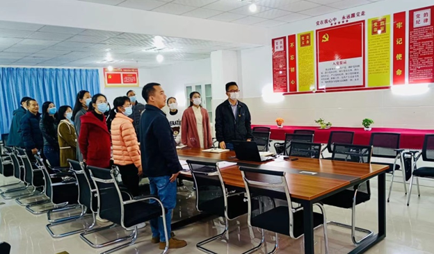 本次支部会议共有四项议程,首先是在支部书记杨登光同志的带领下全体党员起立奏唱国歌并重温入党誓词。面对鲜红的党旗,全体党员高举右手,庄严宣誓,神情庄重、精神饱满,用坚毅的目光、洪亮的声音,诠释对党的无限忠诚和为党的事业奋斗终身的坚定信念。