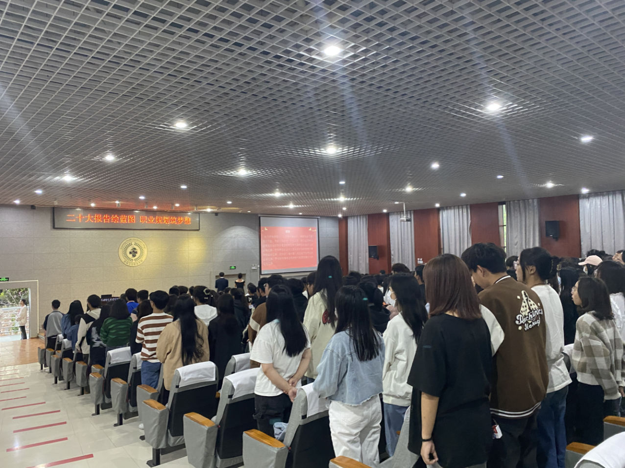 活动开始,全体起立,朗读党的二十大报告内容,“青年强,则国家强。当代中国青年生逢其时,施展才干的舞台无比广阔,实现梦想的前景无比光明...”随着同学们慷慨激昂的朗读声,宣讲活动徐徐展开。