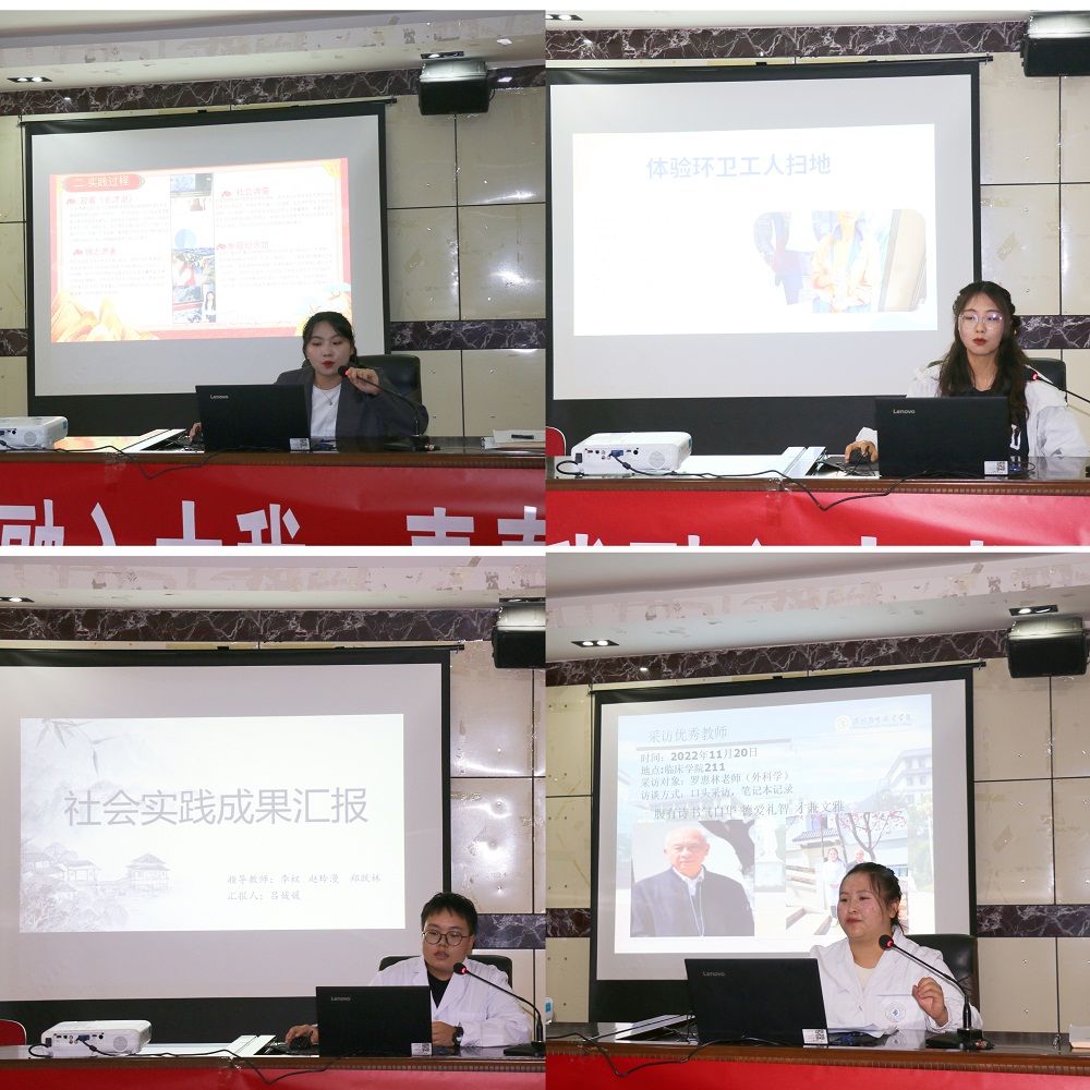 汇报会上,来自口腔学院的何宁同学利用假期同家乡建设美丽街道,与环卫工人“交换身份”,亲身体验环卫工人的辛苦而美丽的一天,深刻体会环卫工人日常工作的不易,感悟“宁愿一人脏,换来万家净”的环卫精神。此外,何宁同学积极践行理论联系实际的观点,学以致用,到口腔诊所进行专业见习;在见习期间不但收获了口腔常见疾病的相关知识,还学会了基本的口腔仪器使用,从而进一步提升个人的专业理论和实践学习。来自临床学院的陈铖同学在入学之初就牢记医学生的使命,在校期间共进行了四次社会实践;陈铖同学与XK星空优秀外科学教师罗惠林老师进行了深入的交流。在校的专业学习中,通过罗老师的精心专业指导,感受到罗老师“腹有诗书气自华”的独特魅力,并表示学习罗老师的职业精神,牢记习近平总书记对广大青年的殷切嘱托,用“医学梦”践行“中国梦”,树立坚定的理想信念,怀抱大爱无疆的高尚情操,掌握过硬的专业本领,做新时代健康事业接班人。