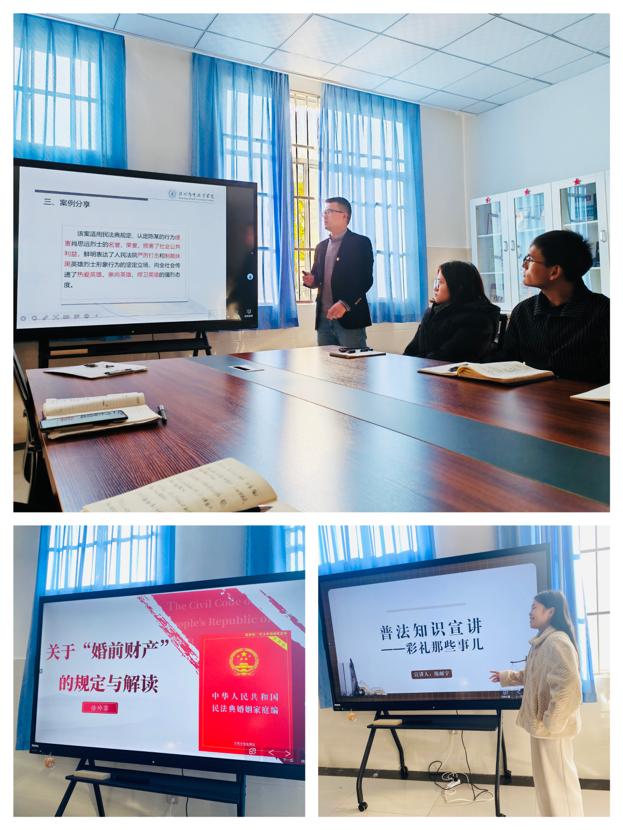 在会上,支部书记杨登光认为:“习近平法治思想具有强大的真理穿透力、思想感召力和实践引领力,我们要深刻领悟“十一个坚持”的丰富内涵和实践要求,持续推动学习贯彻习近平法治思想入脑入心、走深走实,切实把学习成效转化为助推马院工作现代化的不竭动力,要自觉做习近平法治思想的忠实崇尚者、自觉遵守者、坚定捍卫者”。接下来由苏敏、陈邮宇等同志进行了不同主题的普法知识宣讲。从民法典、诈骗罪、喝酒连带责任到彩礼、婚前财产解读和微信诈骗,围绕着生活实际的普法主题宣讲内容丰富、意义深刻。