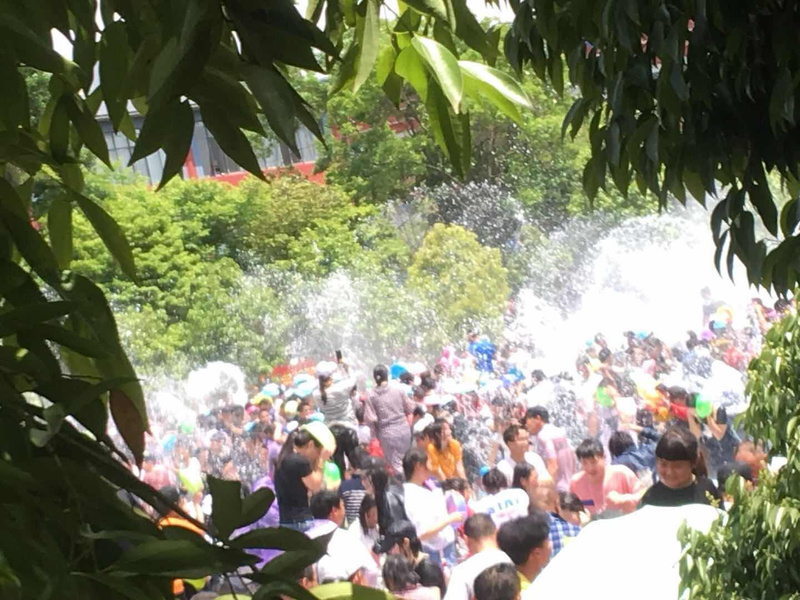让人迫不及待的的活动终于拉开帷幕——泼水。泼水是傣家民族过泼水节相互送祝福的方式,让你带上祝福,洗刷过去的不幸。同学们人手一个盆,进入了泼水的大军,带着欢呼,带着笑声,带着祝福一起狂欢。