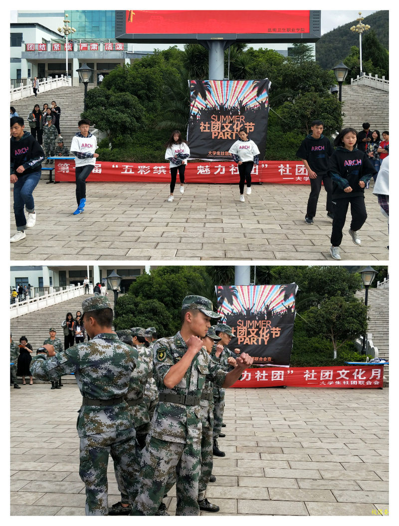 音乐协会激情高亢的歌声、动感的节奏将我们在场的同学们带入到了音乐的世界。在激动人心的氛围中,主持人宣布第十届社团文化月开幕式正式开始。紧接着是由梦想舞团带来的(舞汇星河)节目,同学们整齐的步伐,青春的风采在这里绽放,踏脚跺地,翩翩起舞。最后是由军协的(擒敌拳)结尾,在舞台上,我们看到了他们的英姿飒爽,他们用行动在告诉我们什么是军人,什么是军人作风,无处不在展示着他们的魅力。