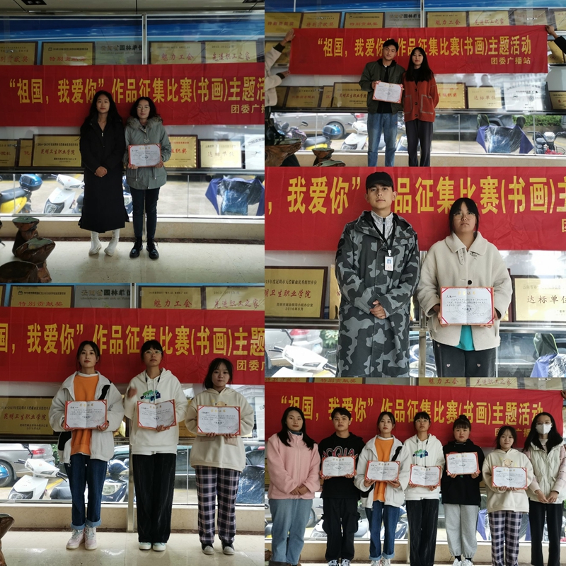 陈以清同学用彩铅一笔一划勾勒出了一副壮阔美丽的画面,将对祖国细致入微的爱表现得淋漓尽致,获得了评委的一致好评,最终获得了第一名;吴敏同学一幅画包括了祖国在各各方面的成就,将祖国的日益强大一一呈现,最终获得了第二名;杨金才同学以一篇书法像各位评委表达了自己对祖国的热爱,最终获得了第三名;张烨、李金遥,袁玥,刘妮娜,王海艳五名同学也以同样优秀的作品脱颖而出获得了优秀奖。