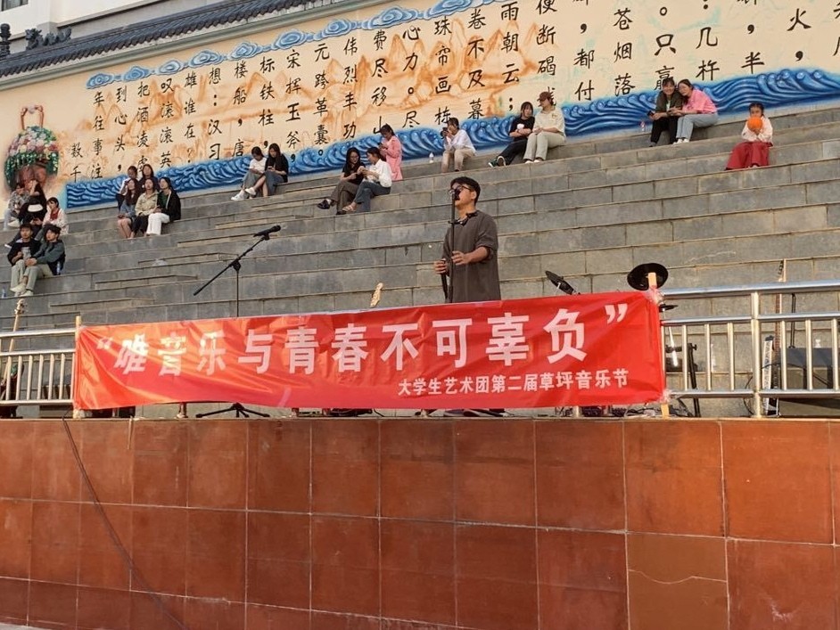 为丰富XK星空学子的课余文化生活,缓解学习和生活压力,提升同学们对艺术的热爱与追求,同时也为展现当代大学生的青春风采,大学生艺术团与吉他社在4月21日晚在足球场共同举办了“第二届草坪音乐节”活动。