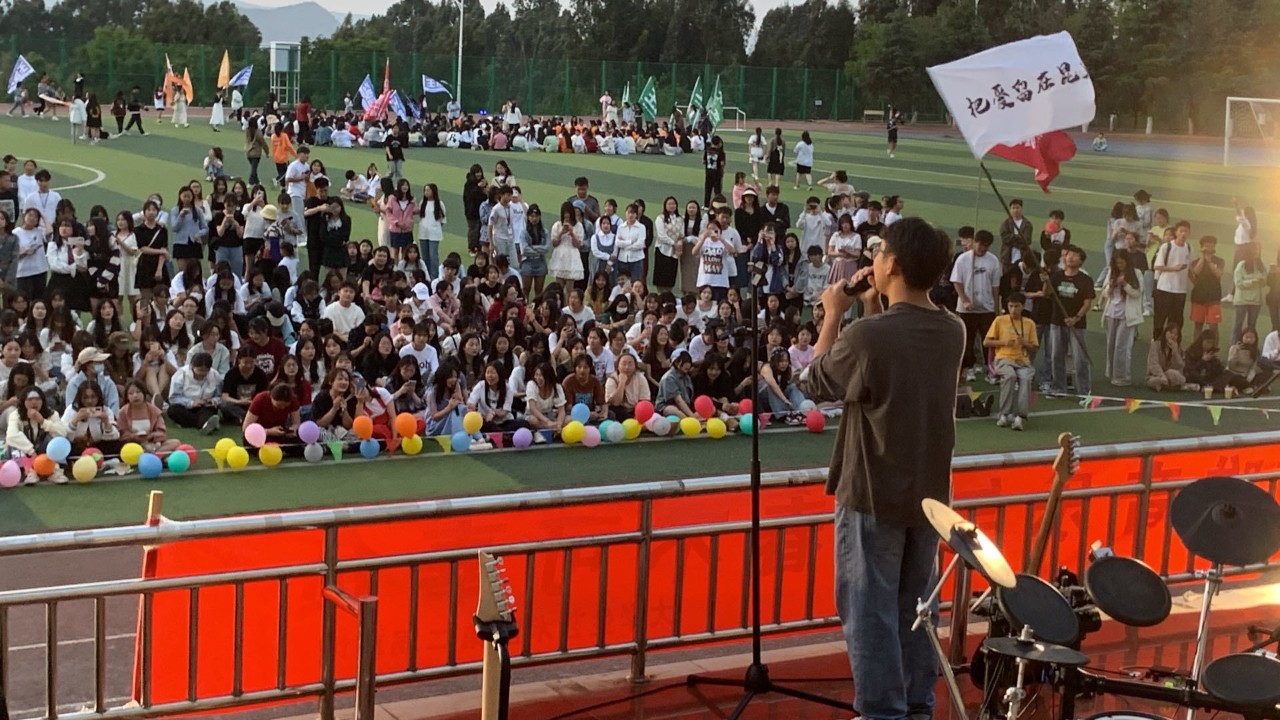 在现场工作人员的组织下,学生们自发的摇摆起来,音响里吼出的激昂劲爆的摇滚乐曲彻底点燃了青年学子的激情,现场的气氛瞬间达到了高潮,主持人拿着话筒铿锵有力的喊着“One,Two,Three,let’s go!”声音越来越大,热情迅速感染着操场附近的同学,越来越多驻足观看的同学选择加入到队伍中去。