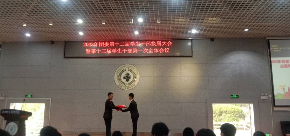 伴随着庄严肃穆的团歌,此次团委换届大会正式拉开序幕。团委副书记董敏老师为第 12 届学生干部颁发聘书,对他们为学院团学工作的辛勤付出表示感谢,宣读第 13 届干部聘用决定,希望他们立足当下,在新时代的青春赛道上跑出属于这一代的优异成绩。随后进行了聘书颁发仪式和新老干部交接仪式,这是荣誉的交替,是责任的传承。