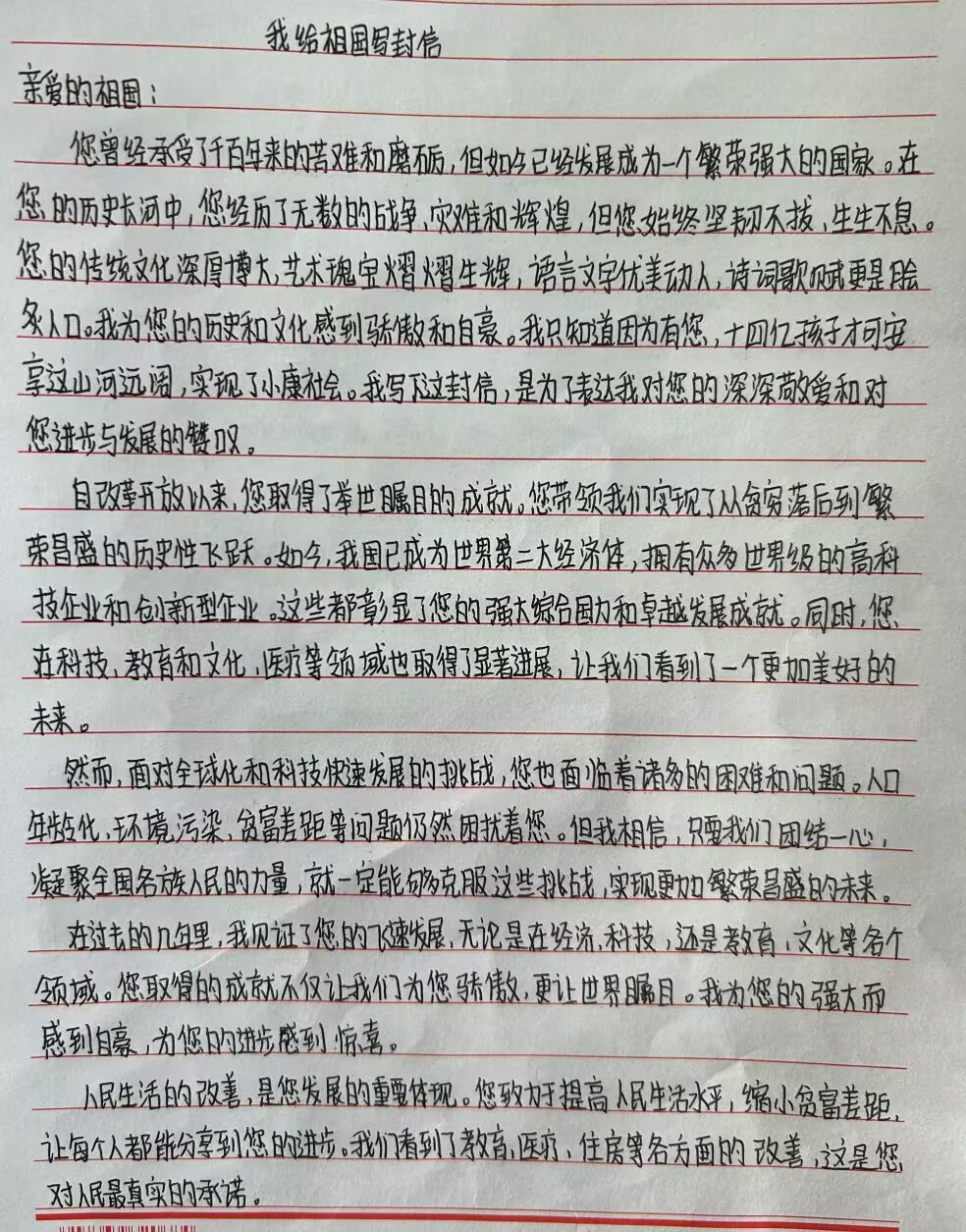 大家的信中,充满了对祖国的赞美和感激。他们说:“祖国,您就像一位伟大的母亲,无论我走到哪里,都能感受到您的温暖和关怀。您的大地养育了我,您的文化熏陶了我,您的人民教育了我。”同学们感谢祖国给予他们的一切,也表达了自己将为祖国的发展贡献自己的一份力量的决心。