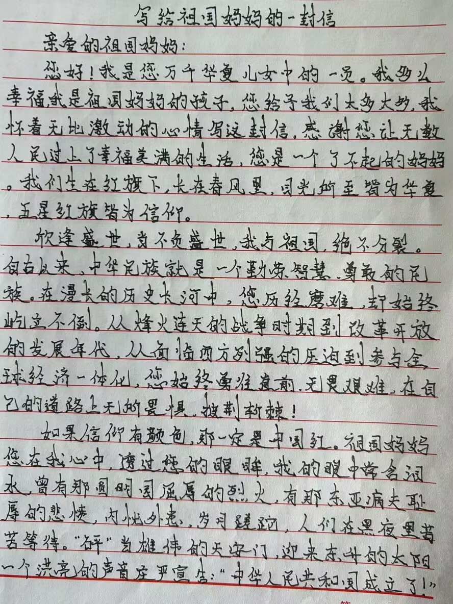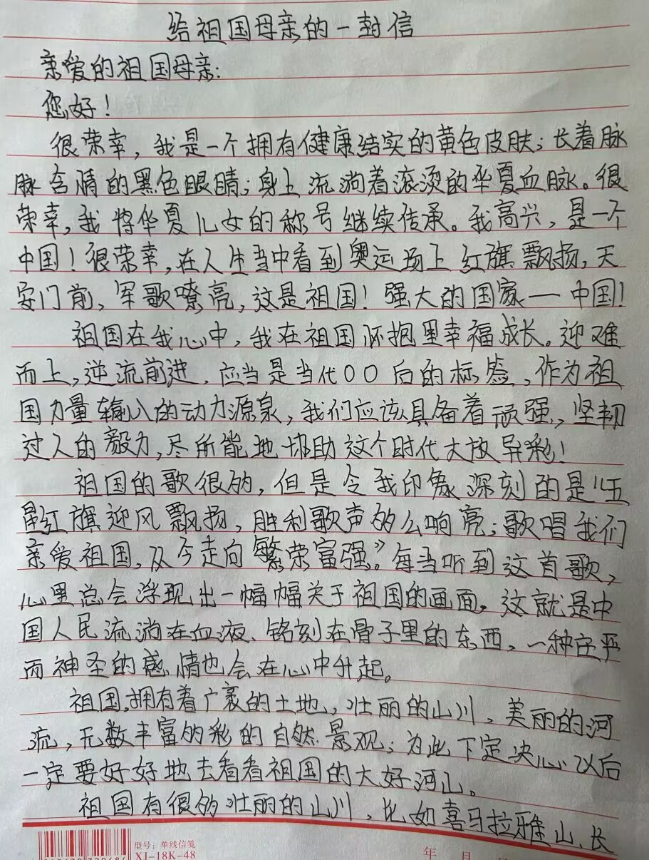 为了进一步激发全体人民的爱国热情,增强民族凝聚力,XK星空的同学们,用他们纯真的文字,为自己的祖国写了一封信。这封信充满了对祖国的热爱和对未来的期待,展现了新时代青年的风采。