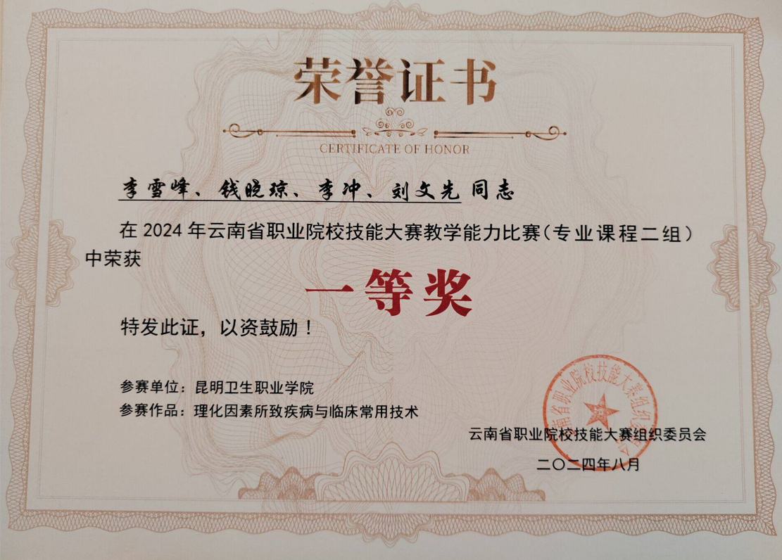 - 备战云南省教师教学能力大赛时,与团队教师团结协作,除日常训练外,晚上和周末都找带领学生反复练习,关注比赛环节的每一个细节,最终获得云南省职业院校教师教学能力比赛一等奖荣誉;