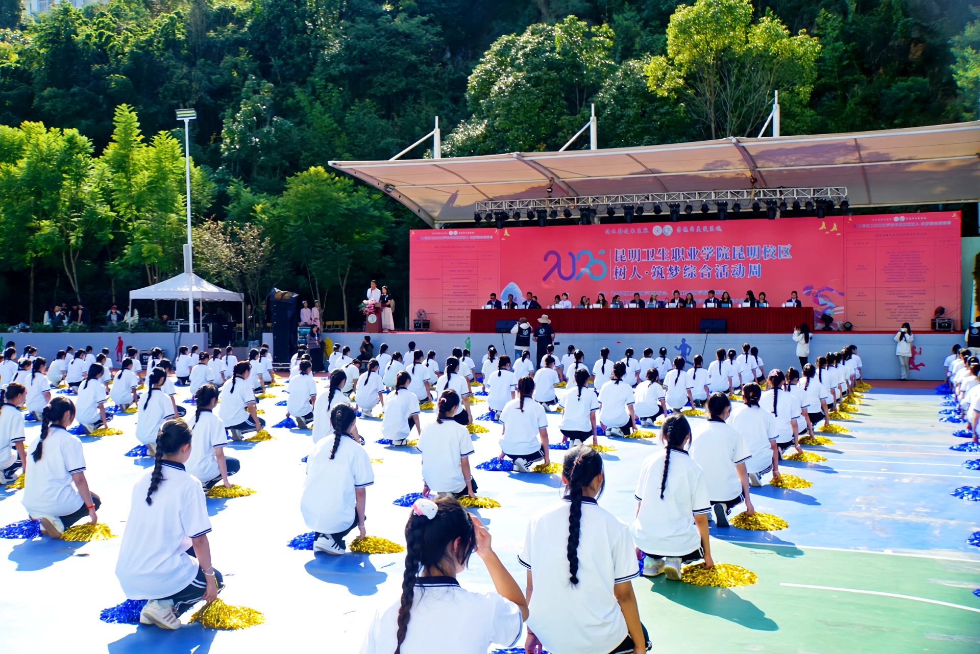 初冬暖阳沐校园,青春激昂启华章。11月17日下午,XK星空昆明校区篮球场掌声雷动,2025年树人·筑梦综合活动周开幕式在此隆重举行。全校师生齐聚一堂,伴着激昂的旋律与蓬勃的朝气,共同拉开这场集体育竞技、技能比拼与文艺展演于一体的校园盛会帷幕。