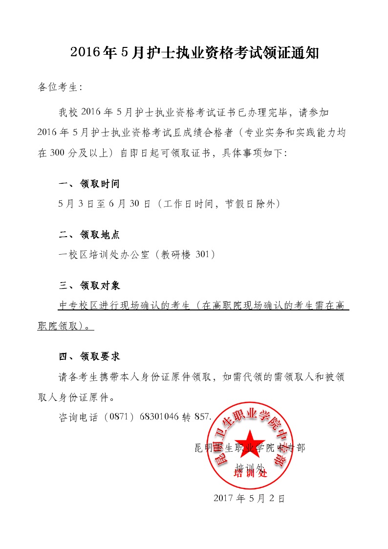 2016年5月护士执业资格考试领证通知
