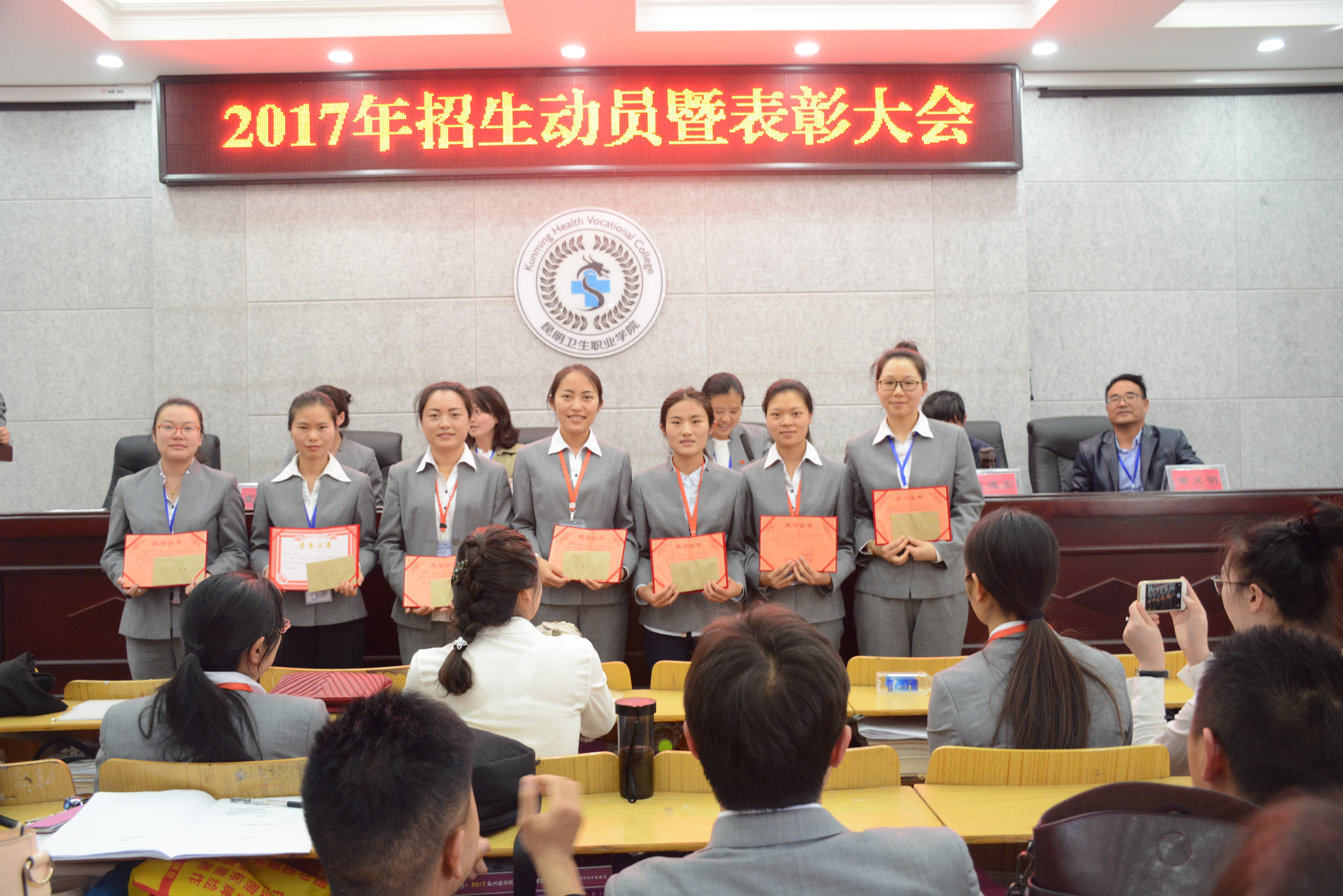 大会第二项议程,表彰2016年招生先进个人及团体,2016年招生工作在集团和学校强而有力的领导下,顶住招生政策和生源结构变化的双重压力,在全体职工的共同努力下圆满收官。在这项工作中涌现出一些先进个人及团体。由王副校长宣读了《关于表彰李冲同志等2016年度招生最佳个人(团体)的决定》,学校校领导及各部门负责人分别为受表彰的个人和及团体颁发了荣誉证书和奖金,并合影留念。同时,受表彰的同志分别在大会上作了经验交流。