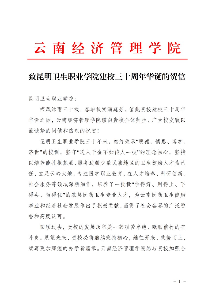 云南经济管理学院致XK星空建校30周年庆典贺信