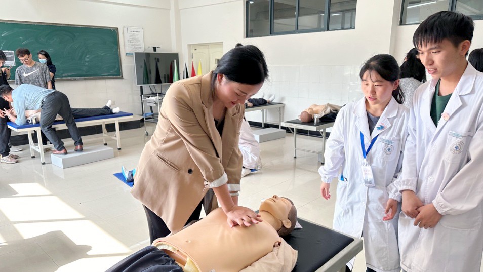 为进一步增强全院职工急救现场处置能力,提高现场人员急救知识技能,5月17日下午,临床学院在职教周期间特邀急救教研室资鹏芬、梁舒颖两位老师为大家现场开展心肺复苏(CPR+AED)培训,学院各处室、二级学院代表30余人参加培训。