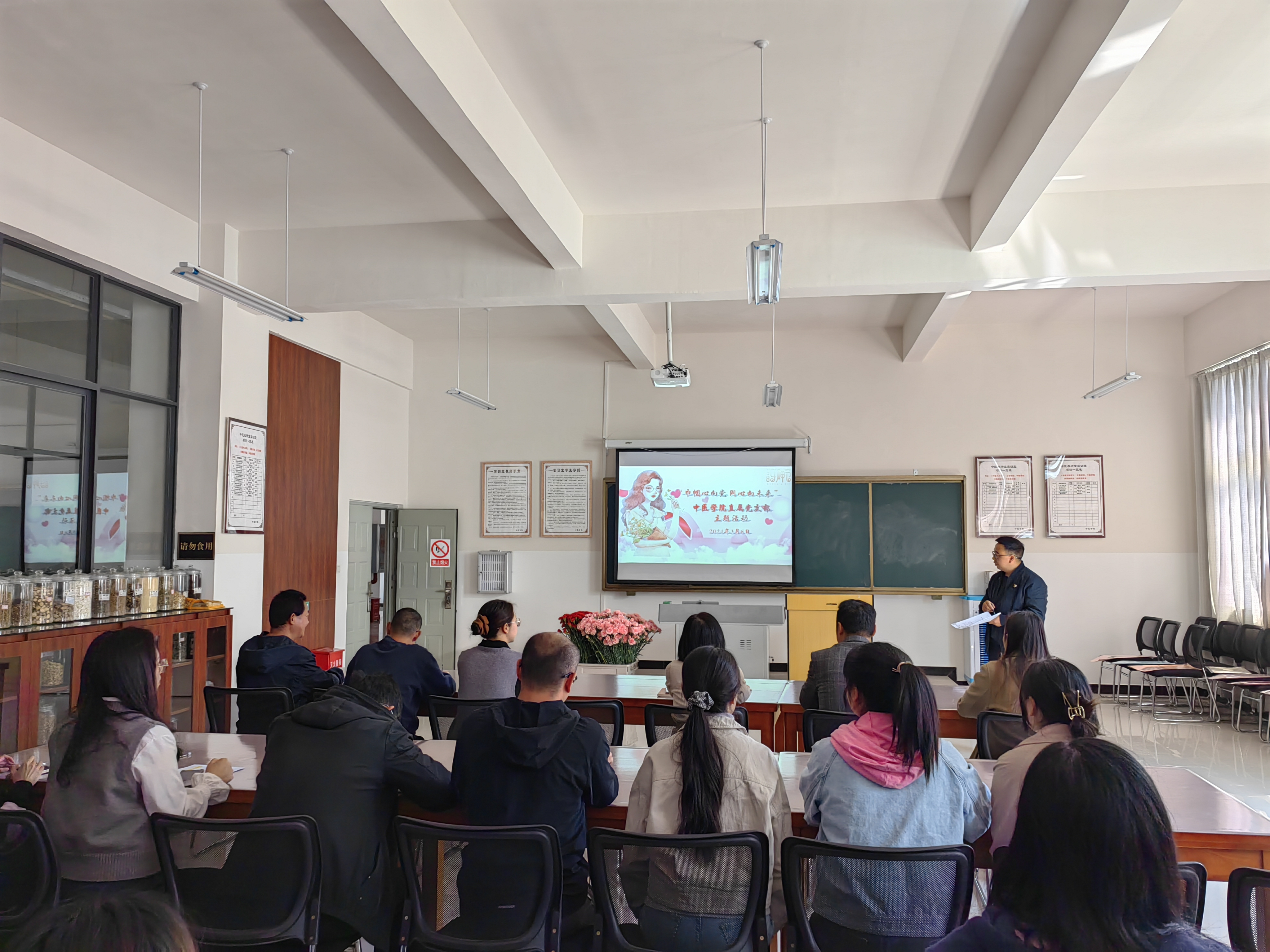 为深入贯彻落实党的二十大精神,充分展示新时代女性健康向上、踔厉奋发的巾帼风采。在第114个“三八”国际妇女节来临之际,中医学院直属党支部于2024年3月6日开展了以“巾帼心向党 同心向未来”为主题的“三八”国际妇女节庆祝活动,活动由中医学院直属党支部书记易斯坐同志主持,中医学院全体教职工参加活动。