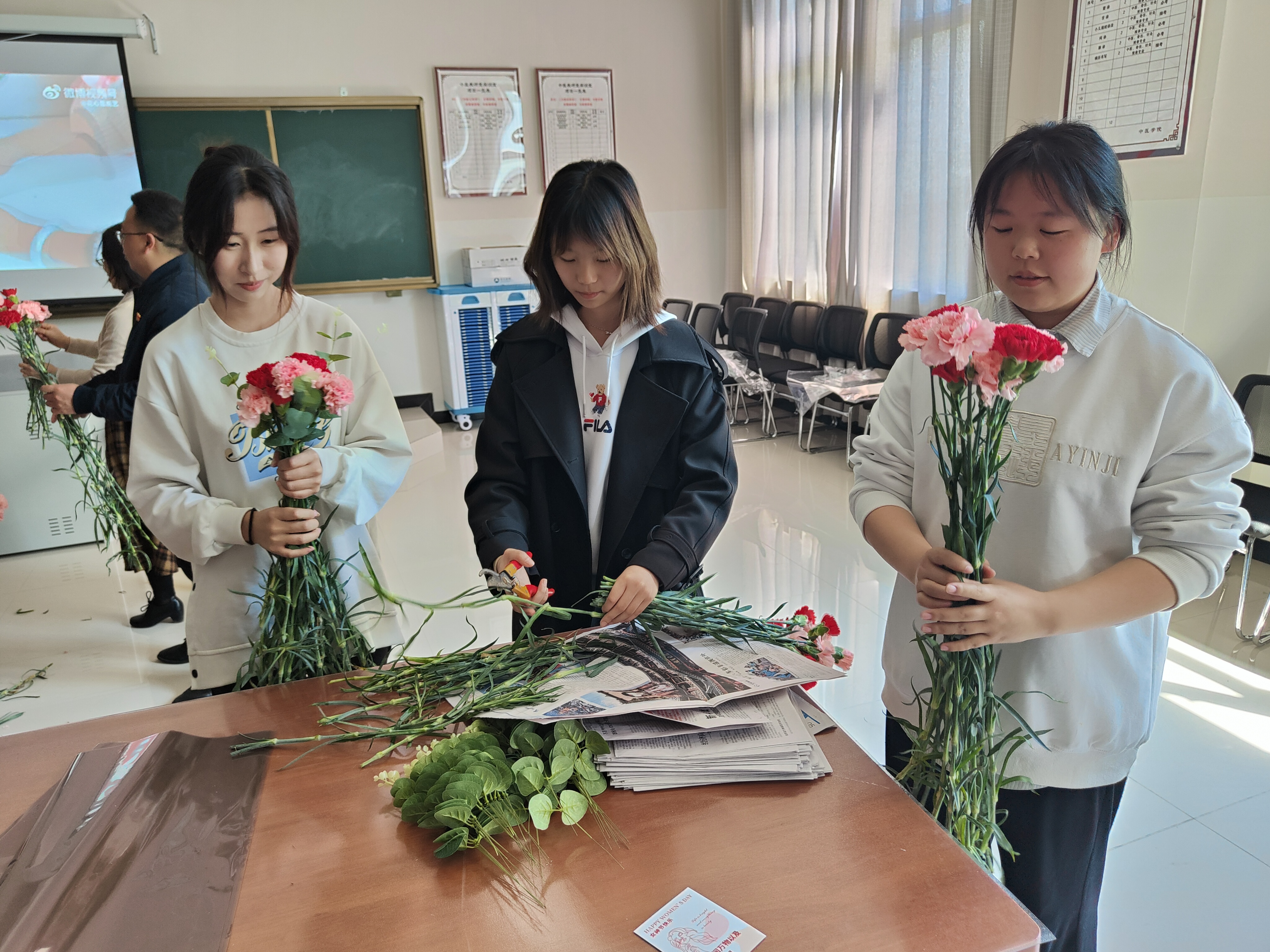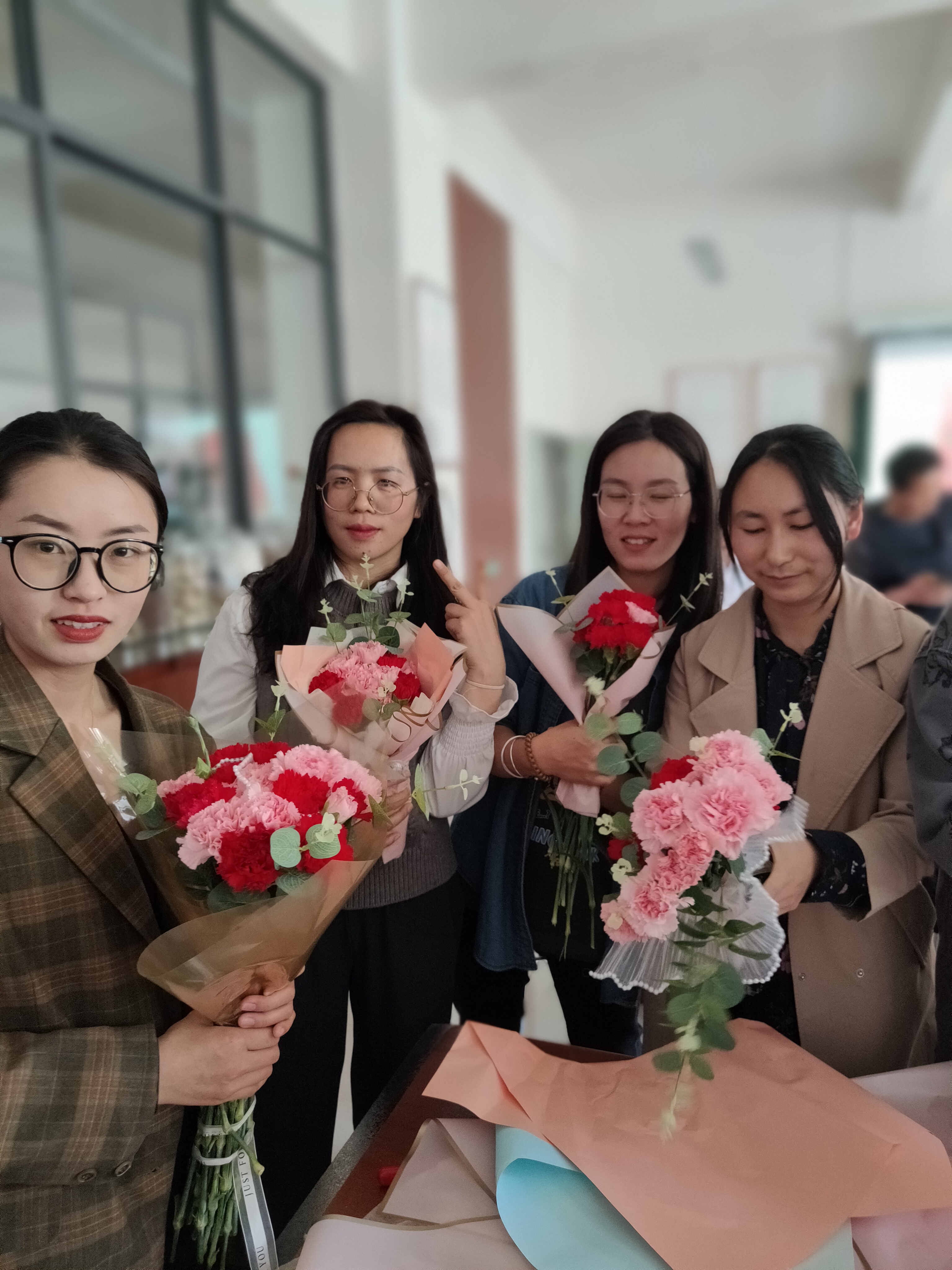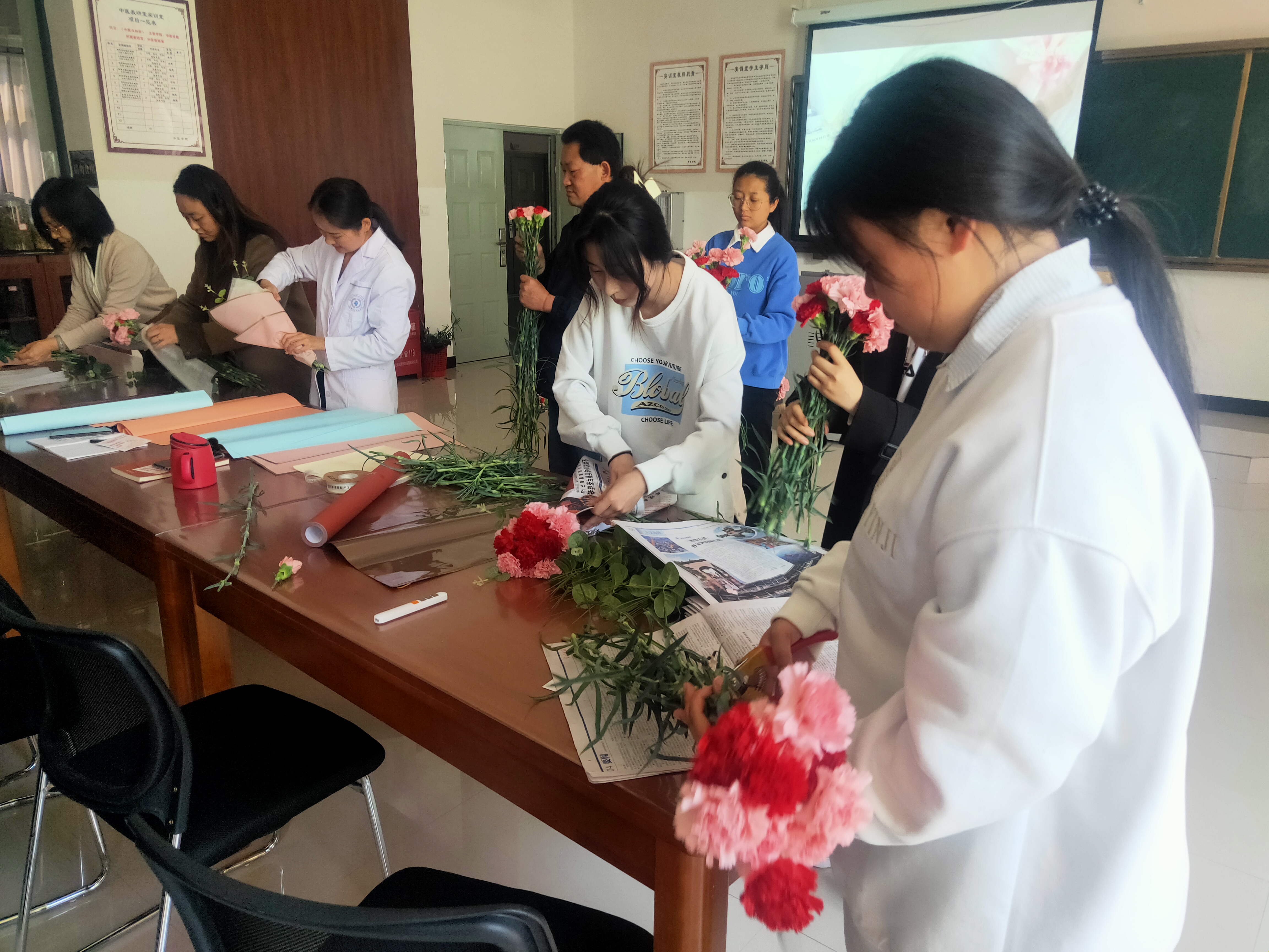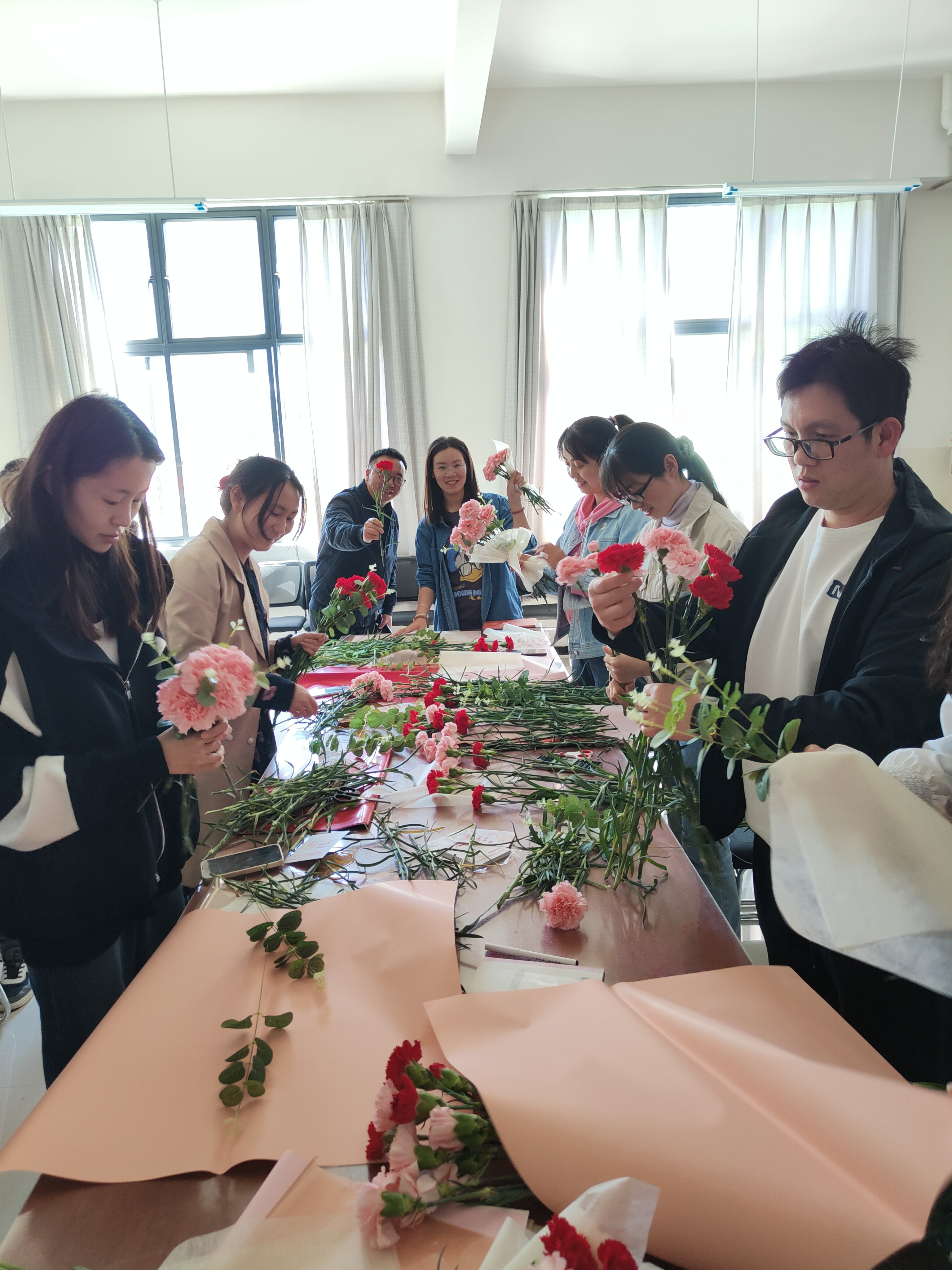 接下来开展了包花活动,老师们纷纷跃跃欲试,发挥创造力,整合造型,使得原本普普通通的花草经过她们的巧手修剪后,错落有致地悄然绽放。大家看着自己创作的花束作品,也感到了满满的成就感与幸福感。包花,作为一门古老而优雅的艺术形式,有着广泛的用途。通过包花,可以表达情感、装饰环境、疏导心情。花朵是大自然的馈赠,不同的花朵有着不同的花语和象征意义。本次活动采用了粉色跟深红色的康乃馨,代表着深深的爱和关怀,以及尊敬之情。