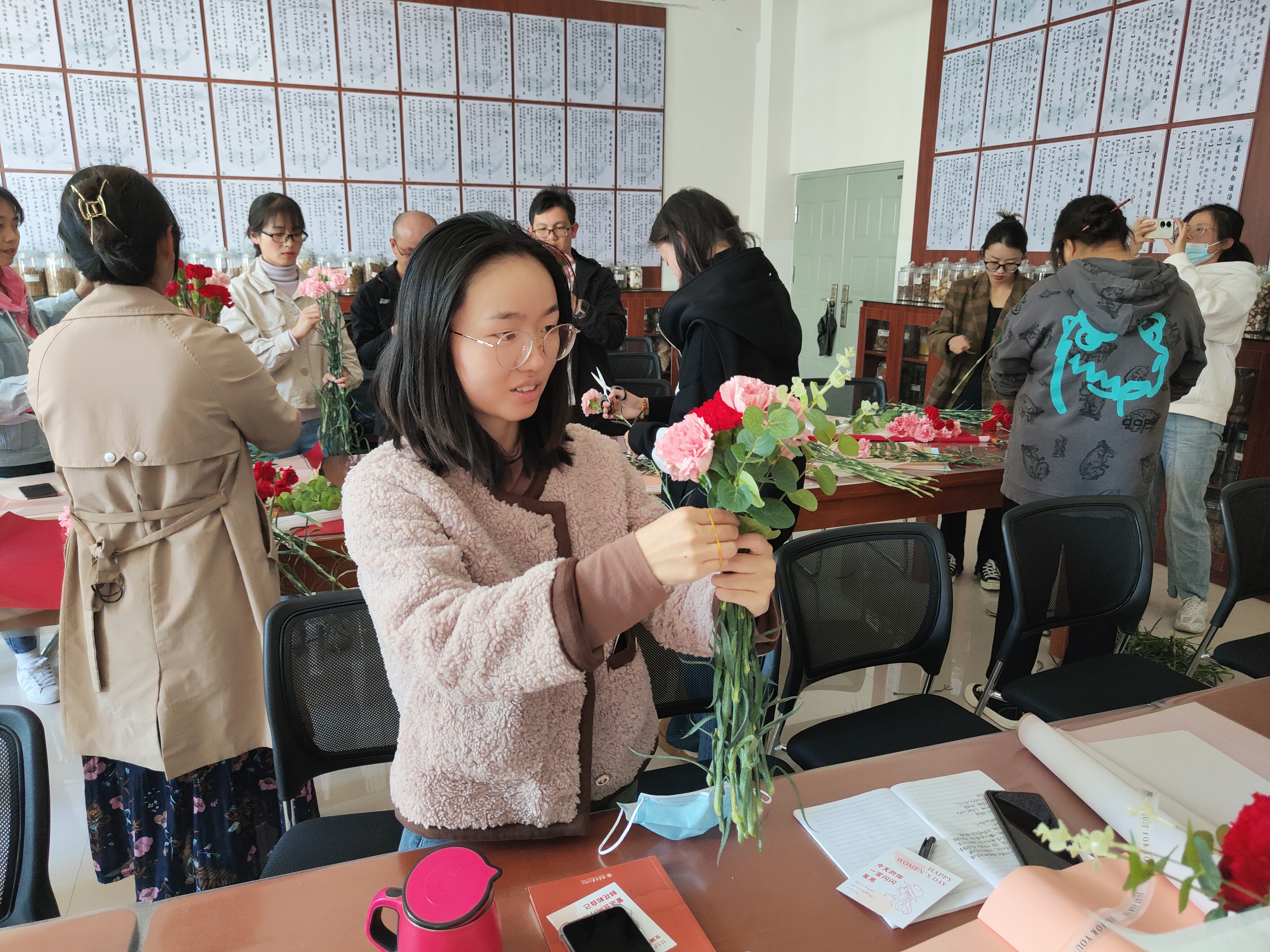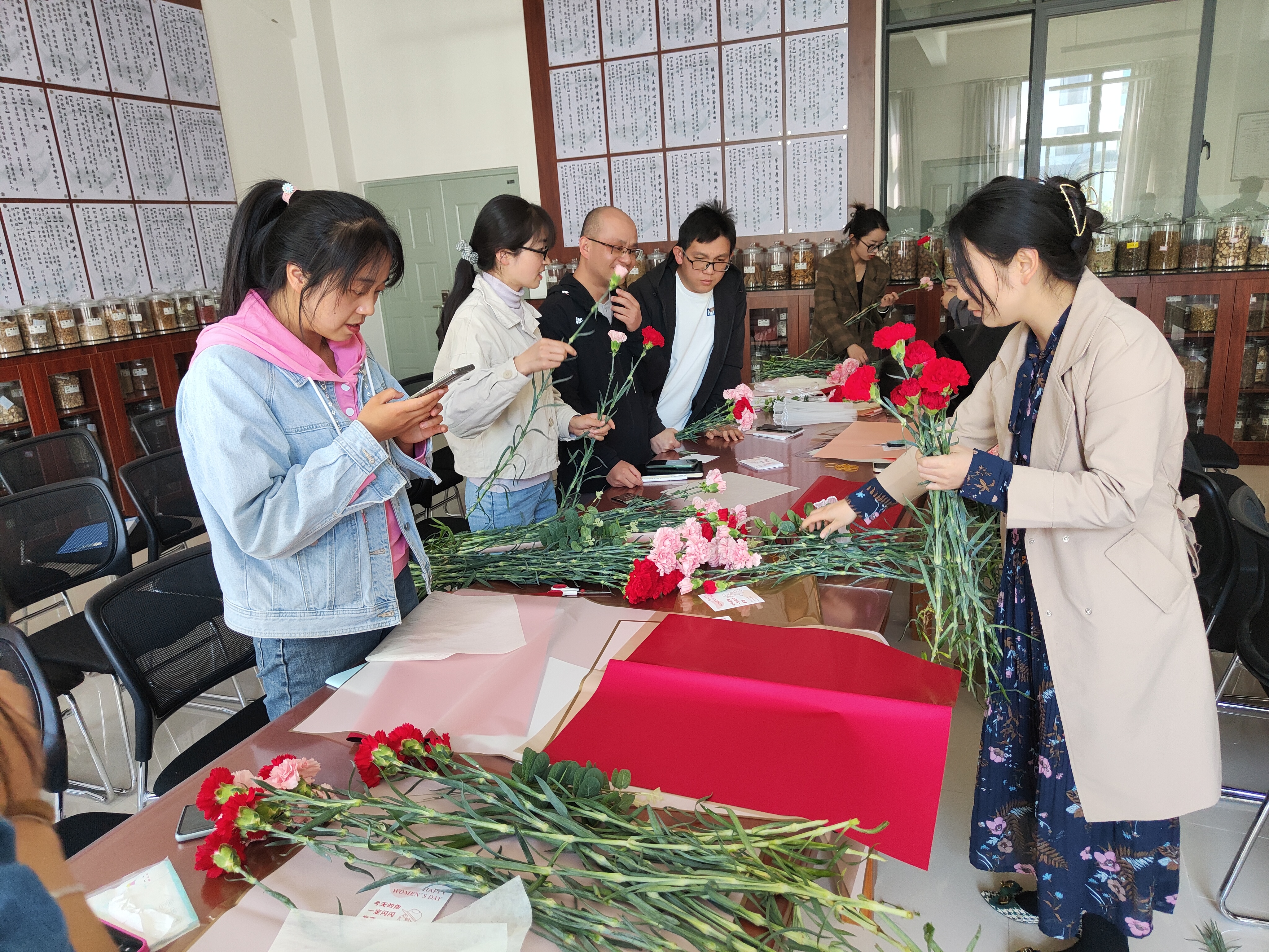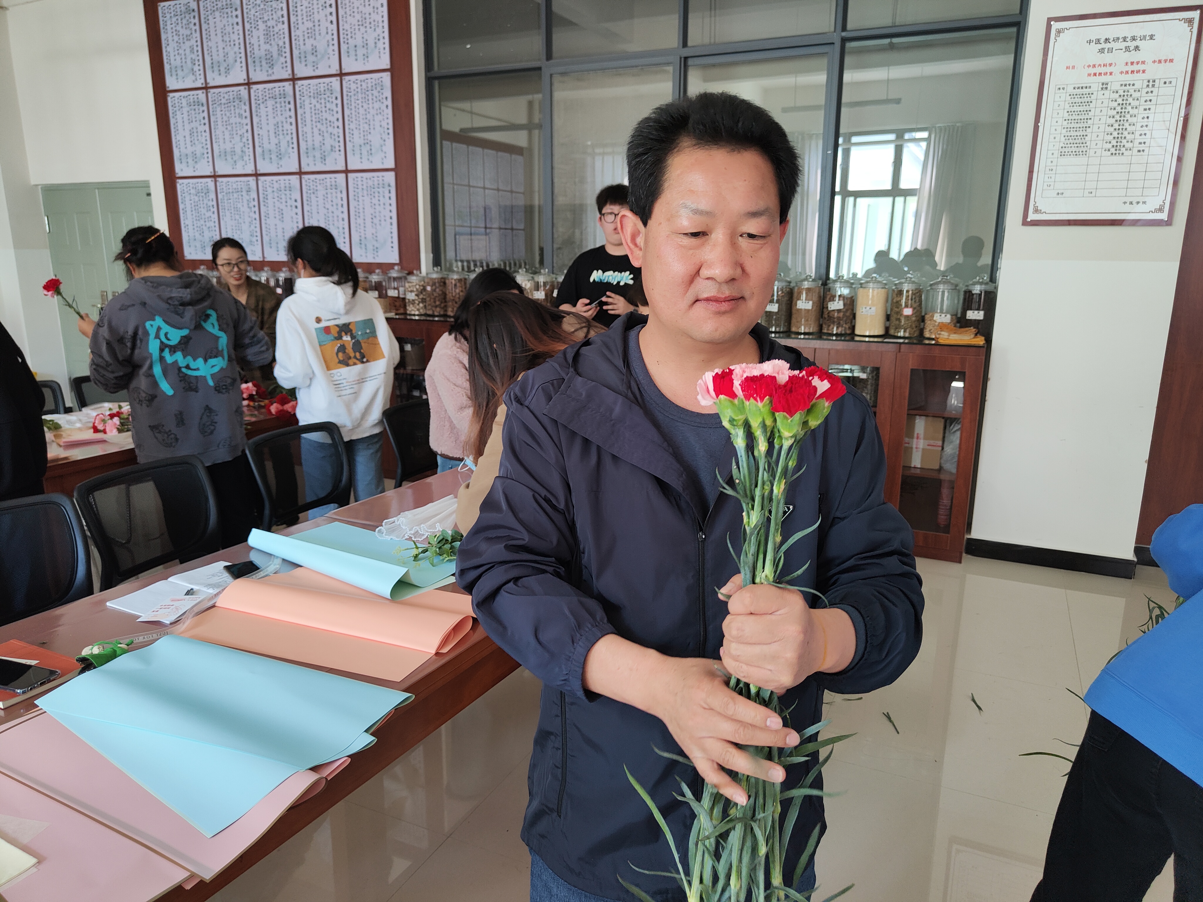 接下来开展了包花活动,老师们纷纷跃跃欲试,发挥创造力,整合造型,使得原本普普通通的花草经过她们的巧手修剪后,错落有致地悄然绽放。大家看着自己创作的花束作品,也感到了满满的成就感与幸福感。包花,作为一门古老而优雅的艺术形式,有着广泛的用途。通过包花,可以表达情感、装饰环境、疏导心情。花朵是大自然的馈赠,不同的花朵有着不同的花语和象征意义。本次活动采用了粉色跟深红色的康乃馨,代表着深深的爱和关怀,以及尊敬之情。