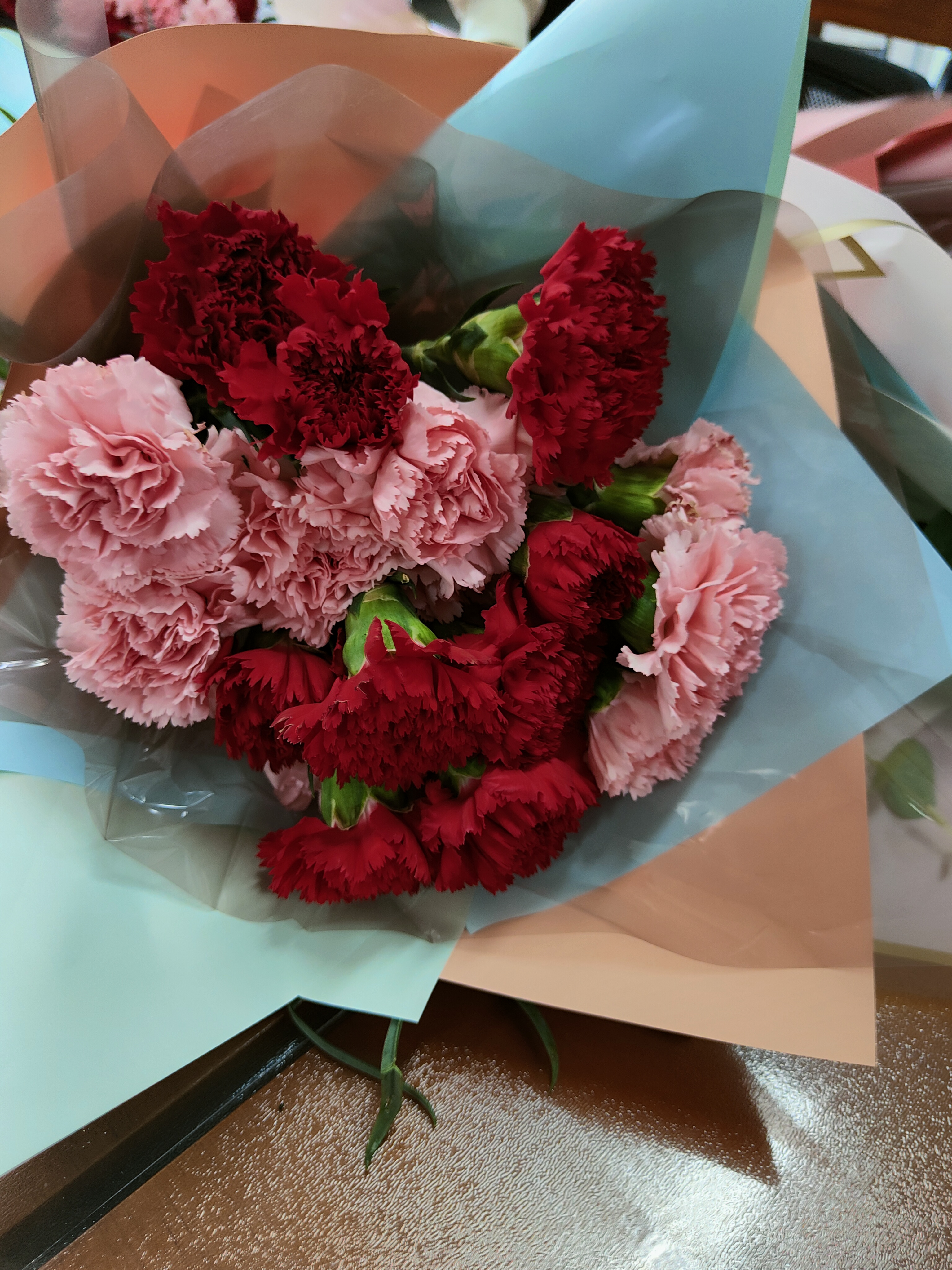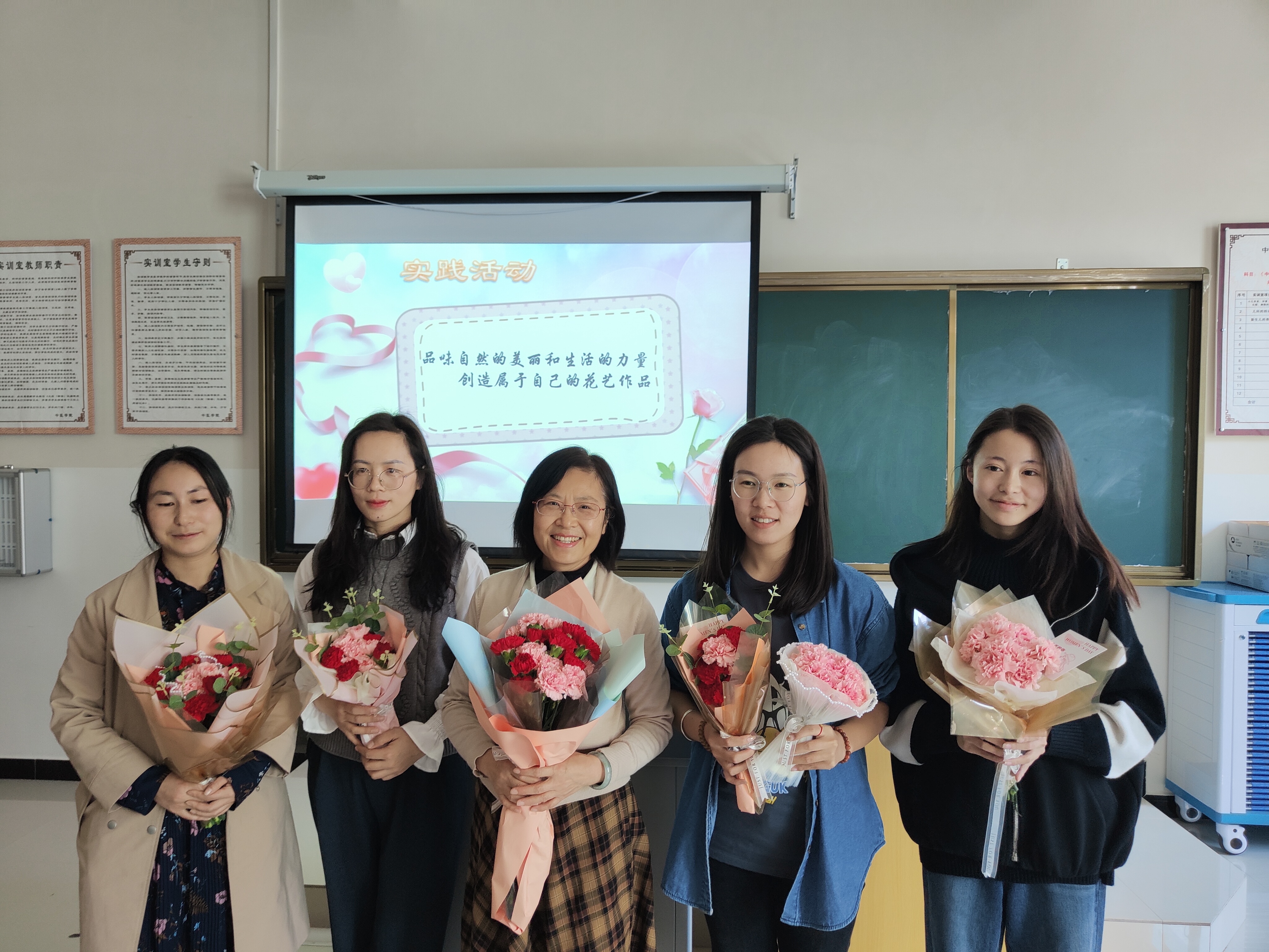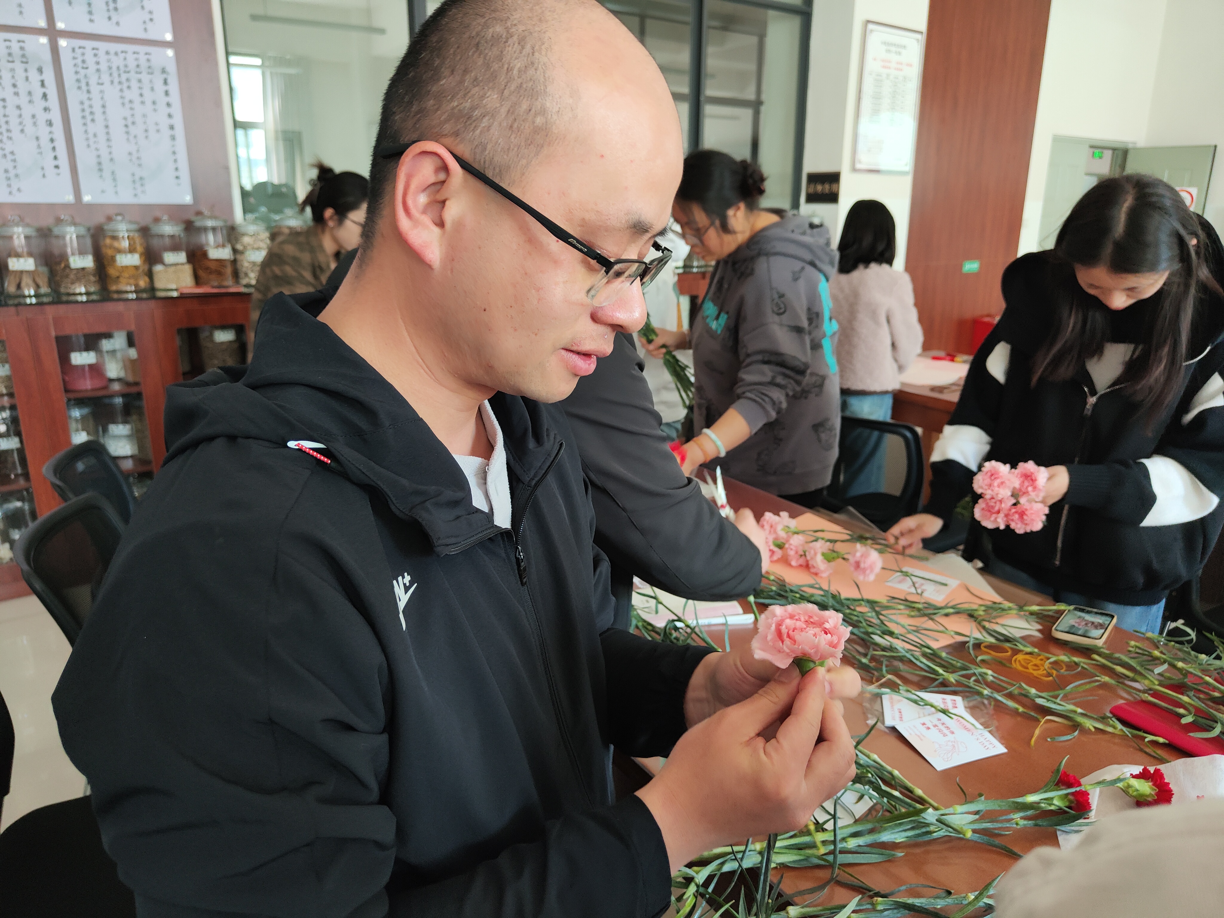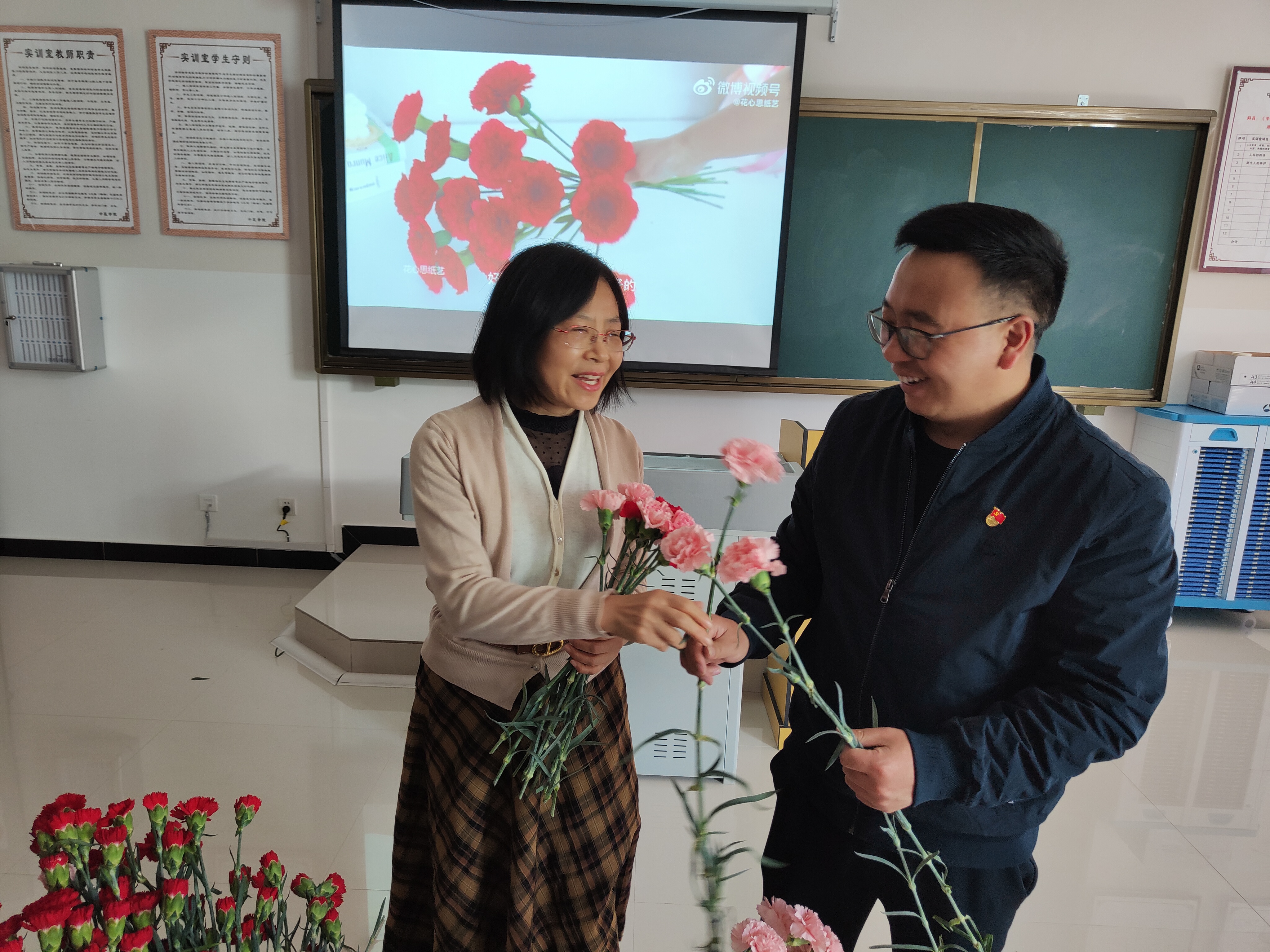 接下来开展了包花活动,老师们纷纷跃跃欲试,发挥创造力,整合造型,使得原本普普通通的花草经过她们的巧手修剪后,错落有致地悄然绽放。大家看着自己创作的花束作品,也感到了满满的成就感与幸福感。包花,作为一门古老而优雅的艺术形式,有着广泛的用途。通过包花,可以表达情感、装饰环境、疏导心情。花朵是大自然的馈赠,不同的花朵有着不同的花语和象征意义。本次活动采用了粉色跟深红色的康乃馨,代表着深深的爱和关怀,以及尊敬之情。