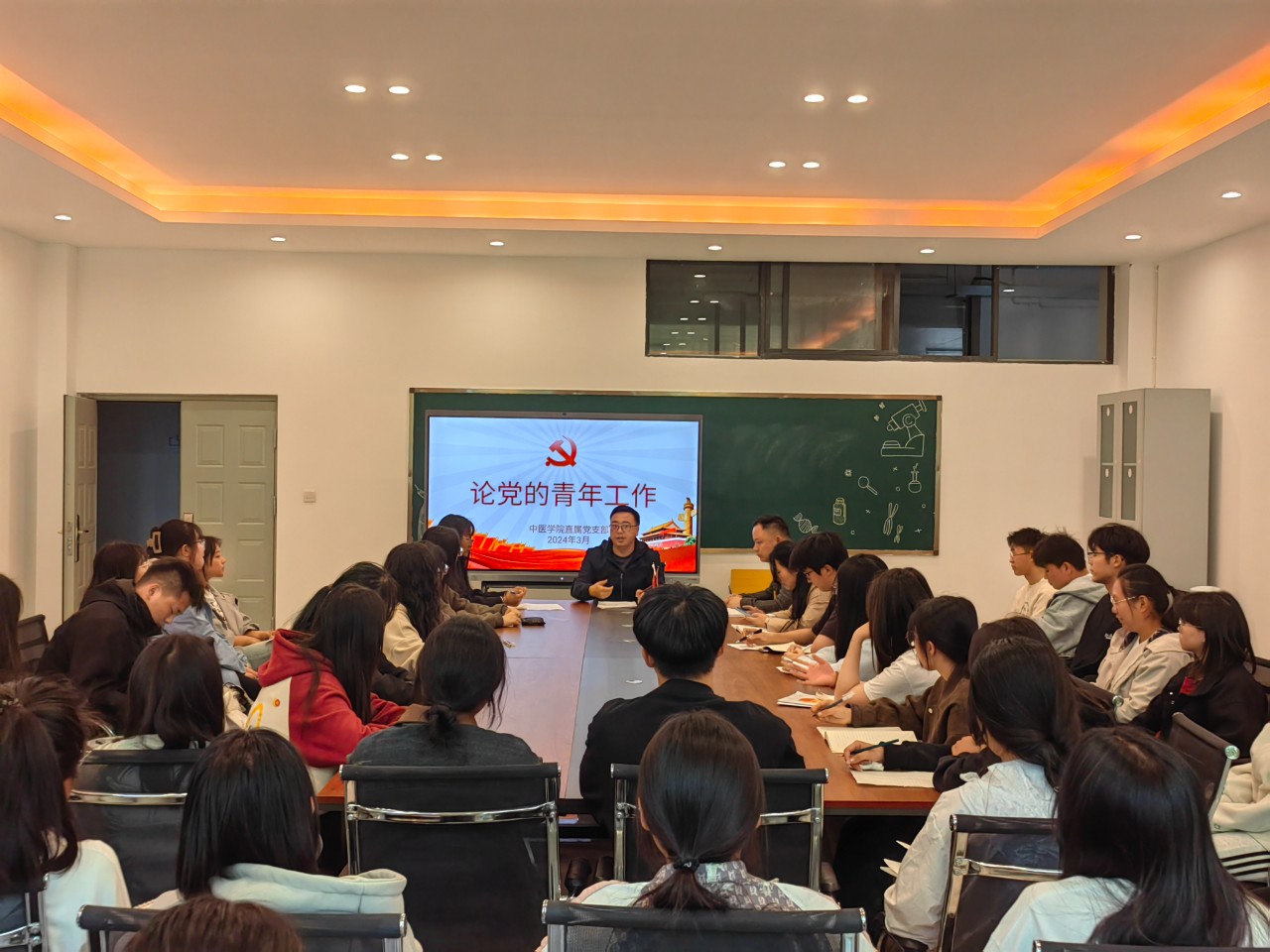 中医学院直属党支部书记易斯坐同志以“论党的青年工作”为题,主要围绕党的青年工作的历史、现状和未来发展方向进行了深入的探讨和交流。