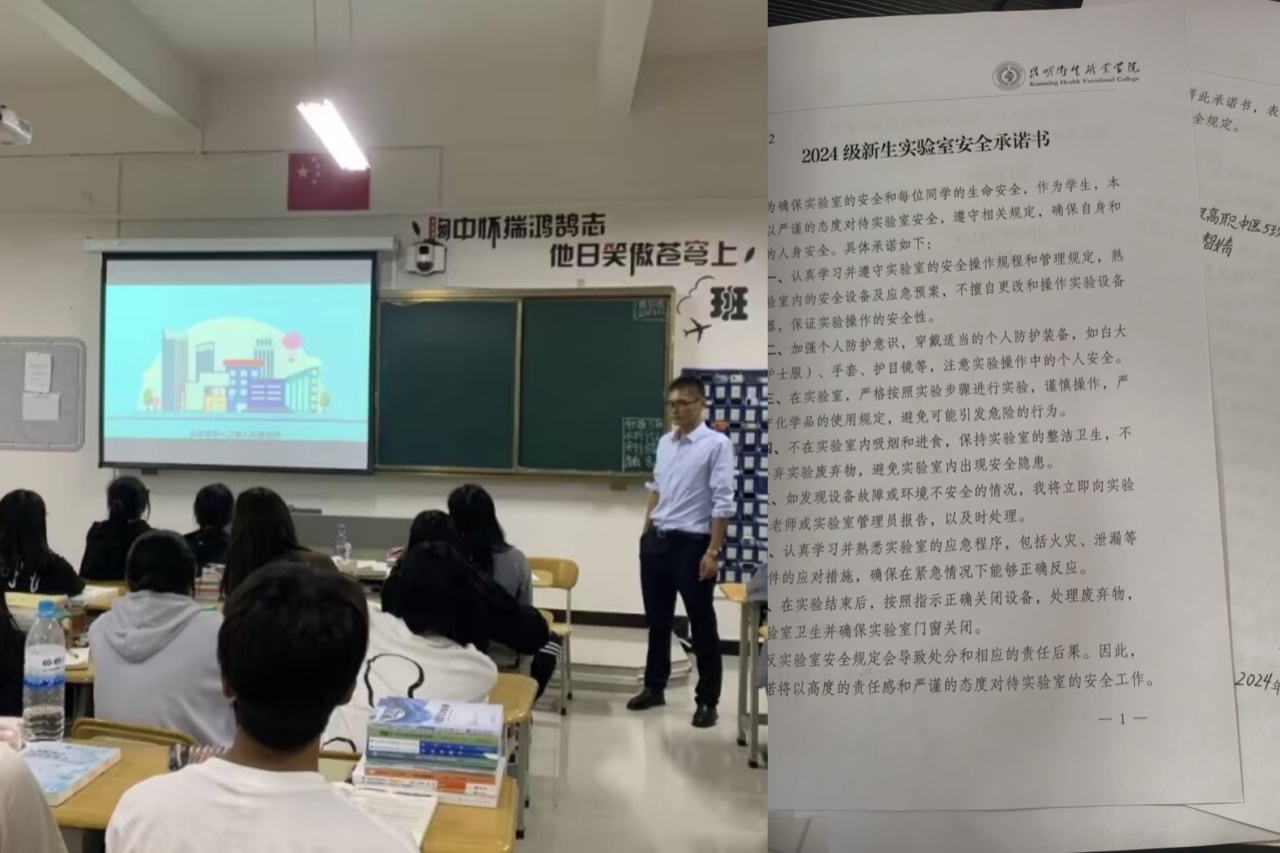 首先,中医学院辅导员组织全体新生认真阅读《XK星空实验实训安全手册》,共同学习实验室安全相关视频,细致讲解了实验室安全的重要性,最后由班主任组织全体同学签订2024 级新生实验室安全承诺书。