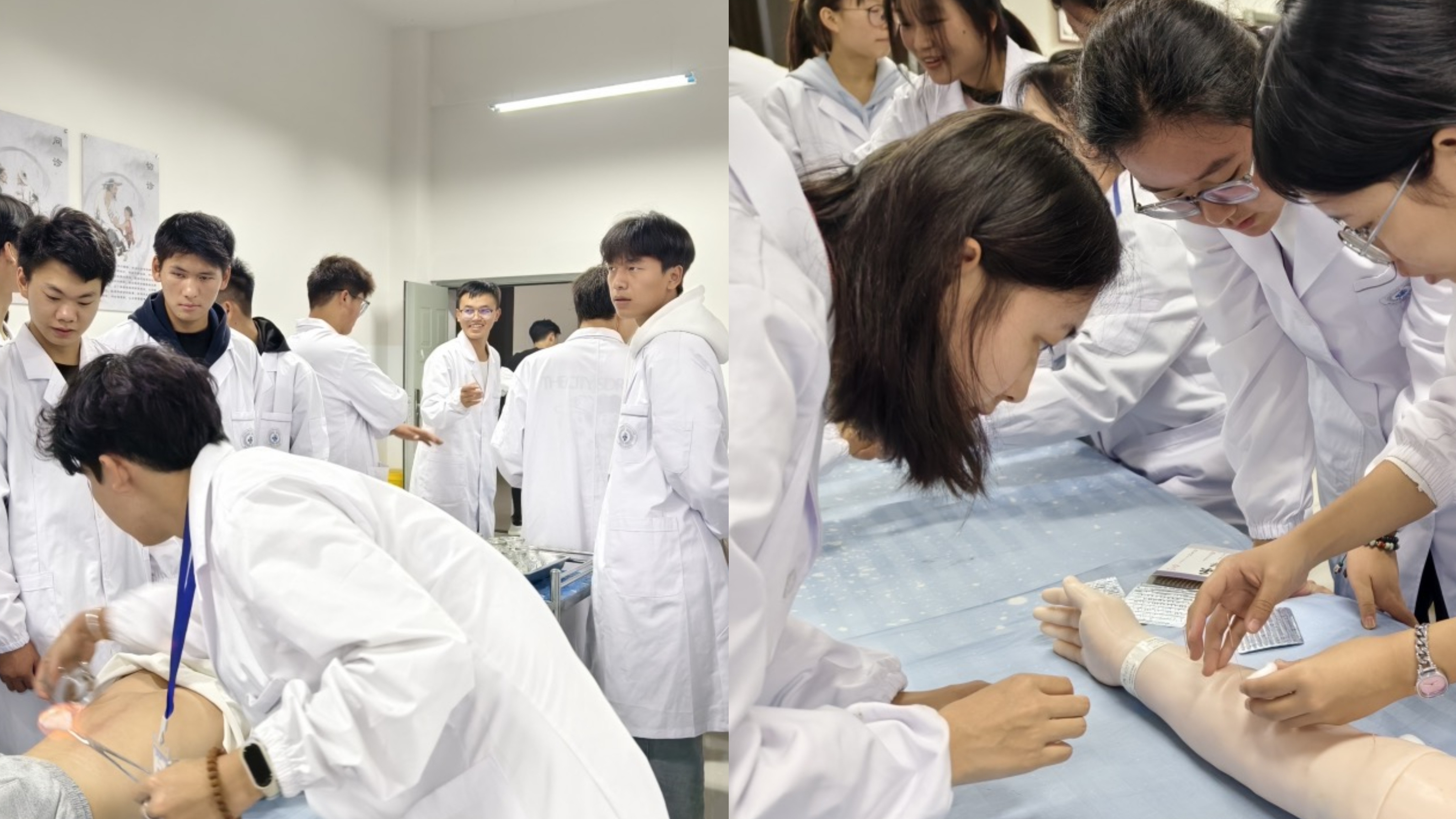 紧接着,在中医学院教学办老师的带领下,24级新生参观了中医学院的各间实训室。实训室内,23级学生助教们全神贯注地进行着技能展示,他们的每一个动作都精准而娴熟,仿佛在书写着中医实训的精彩篇章。24 级新生们围拢在四周,眼神中充满了好奇与期待。通过这次参观,新生们对未来三年需要学习的实训技能有了初步的认识,那一个个熟练的操作、一件件精密的仪器,如同闪耀的星星,照亮了他们即将踏上的中医学习之路。在这个充满着知识与探索的实验室里,新生们感受到了中医实训的魅力与挑战,也为他们的学习生涯注入了新的动力和希望。