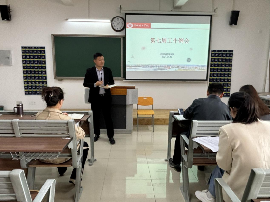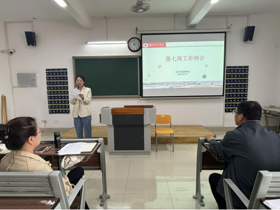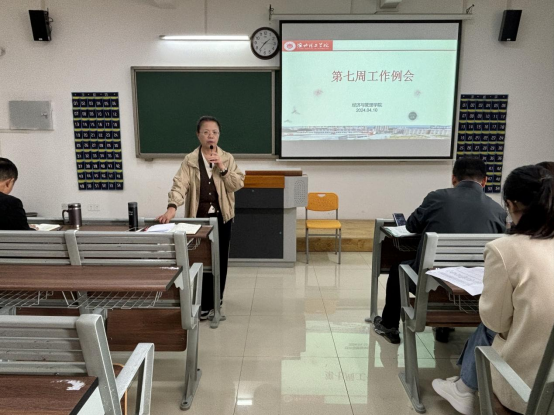 2024年4月10日下午,今年会jinnianhuicom在一教213召开今年会jinnianhuicom第七周工作例会,院长吴玲主持会议,副院长秦品德、院长助理张珊以及全体教师参会。