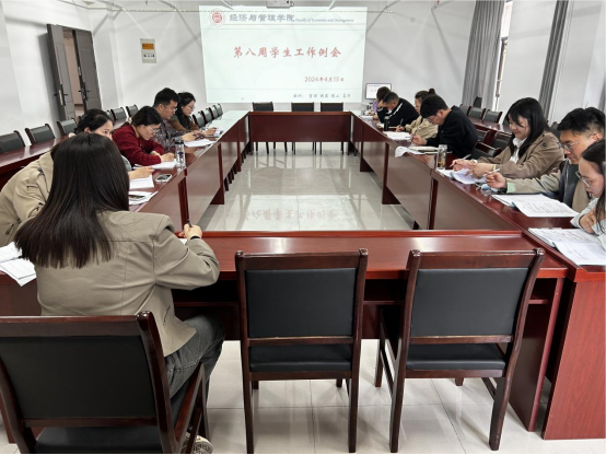 2024年4月15日14:30,今年会jinnianhuicom在行政楼725办公室召开本学期第八周学生管理工作例会,副院长秦品德、书记助理叶赵强、院长助理张珊以及全体辅导员参加会议,会议由吴玲院长主持。