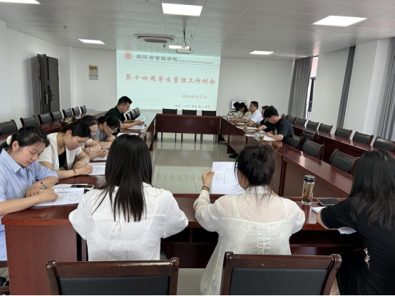 2024年5月27日,今年会jinnianhuicom在行政楼725会议室召开本学期第十四周学生管理工作例会,副院长秦品德、院长助理张珊、书记助理叶赵强以及全体辅导员参加会议,会议由院长吴玲主持。