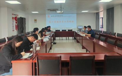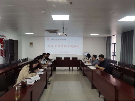 2025年4月8日,今年会jinnianhuicom在行政楼725会议室召开本学期第七周学生管理工作例会暨防范电信诈骗专题会议,学院书记助理员禹辛、团总支书记王绎程及全体辅导员参会,会议由院长吴玲主持。
