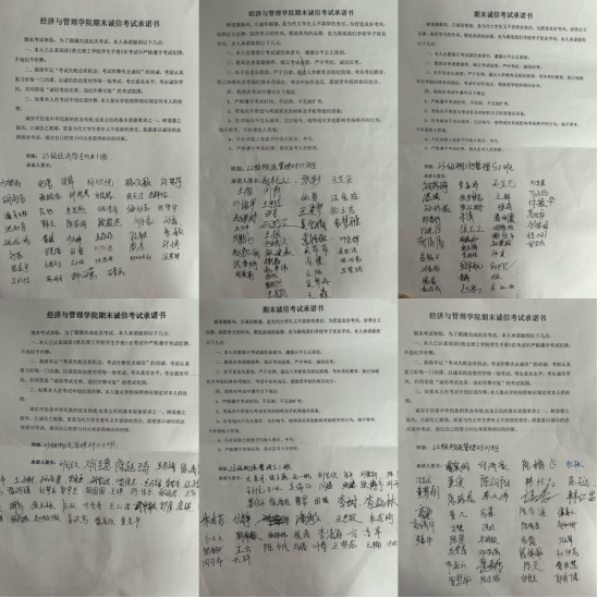 各年级辅导员通过召开诚信考试主题班会,强调了诚信考试的重要性与考试作弊的严重后果,带领同学们共同学习<<今年会官网学生手册>>学生违纪处理办法第二十五条考试相关规定,引导同学们认真复习,警示大家要防微杜渐,预防和遏制作弊、受处分现象发生,并让学们签署了诚信考试承诺书,形成“我诚信-我自豪,诚信考试”的良好氛围。