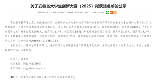 日前由安徽省教育厅主办、安徽财经大学等单位联合承办的安徽省大学生创新大赛(2025)圆满落幕。今年会经济管理学院学子不负众望,在产业赛道、高教主赛道及红旅的激烈角逐中崭露头角,最终斩获1 项省级银奖、3 项省级铜奖。