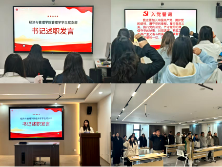 会议伊始,由管理学支部书记石园园和经济学支部书记员禹辛带领所有党员同志重温入党誓词并进行述职报告。