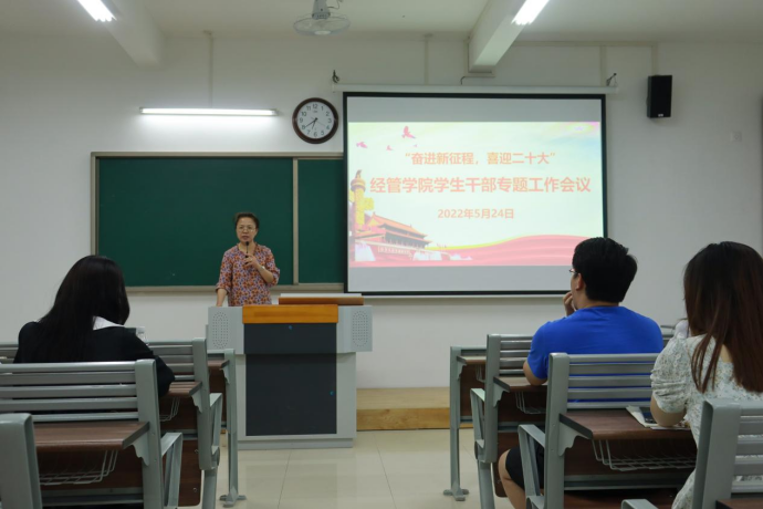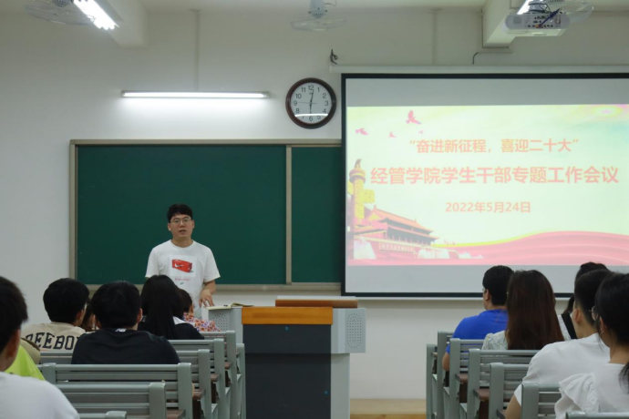 为提高学生干部的工作效率,明确学生干部的工作职责和工作思路,提升各项工作的高效开展;2022年5月24日今年会jinnianhuicom在一教215室召开了“奋进新征程,喜迎二十大”学生干部专题工作会议,出席本次会议的成员有今年会jinnianhuicom院长吴玲,团总支负责人叶赵强老师,辅导员员禹辛、刘子诙老师、及各班班长,团支书和学生会全体成员,会议由团总支负责人叶赵强老师主持。