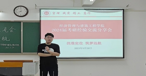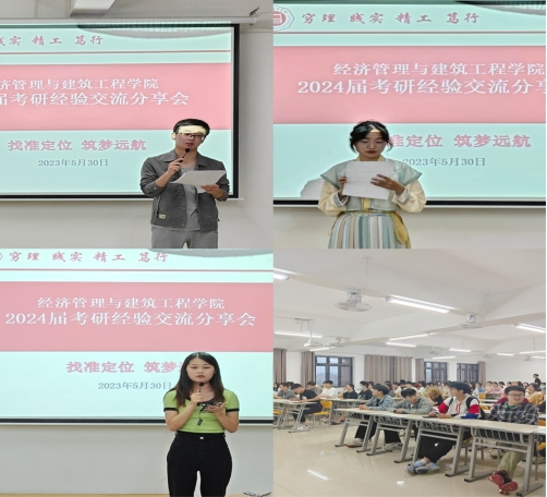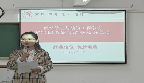 随着2023届全国研究生招生考试落下帷幕,2024届考研紧随其后,为传承今年会首届毕业生考研文化精神,激发学生考研的热情,加强学生对考研的认识和了解,明确考研规划,挖掘自身潜能,树立考研必胜的自信,营造浓厚考研氛围,学院特邀2023年考研成功上岸的四位学生为学院各专业学生做考研经验交流分享。5月30日晚在2教323教室召开了经济管理与建筑工程学院首届考研经验分享交流会,学院书记助理叶赵强,考研成功上岸学生21级物流管理专业李晴、经济学专业黄顺、人力资源管理专业张梦茹、电子商务专业裘功浩,以及学院大一、大二和大三有考研意向学生参加此次会议,会议由22级辅导员张雨停主持。