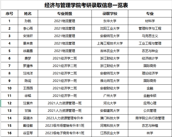 今年经管学院普本考研录取率达7.4%,实现普本考研录取率的开门红,物流管理专业考研录取率更是勇攀23.8%的高峰。物流管理班的孙航同学凭借优异成绩跨学科考入东华大学(211工程高校)材料学专业,成为学院首位进入“双一流”名校深造的学子。
