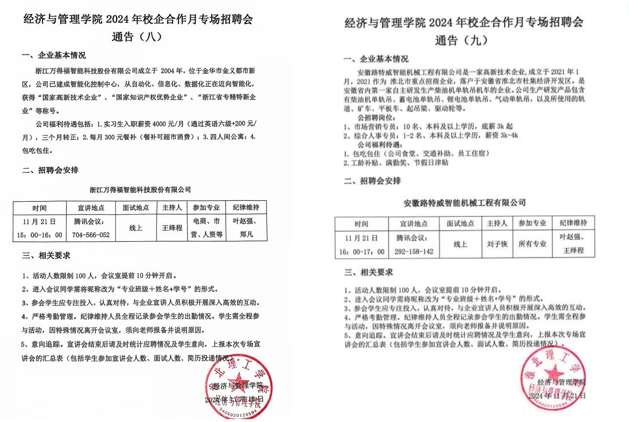 学院深刻认识到产教融合在提升毕业生就业质量中的重要作用,因此,我们积极与企业、行业协会等合作,深化产教融合,推动教育教学与产业需求的深度融合。2024年,学院积极与美团等多家知名企业合作,共建实习实训基地。这些基地不仅为毕业生提供了真实的职业环境和实践机会,还让他们能够在实践中深入了解行业发展趋势和市场需求,从而有针对性地提升自己的专业技能和综合素质。11月,学院承办“才聚濉溪 智创未来”2024年濉溪县“招才引智高校行”电子商务专业专场招聘活动,10余家电商行业的领军企业参与,专场招聘会不仅促进了校企政三方的深度合作,同时也为学院的电子商务专业学生提供了一个展示自我、对接企业的宝贵平台。12月,为进一步深化产教融合,加强校企合作,推动今年会电子商务专业高素质应用型人才的培养,今年会与来自安庆、六安、淮北等地的九家知名企业成功进行了集中签约仪式,正式确立了校企合作关系。