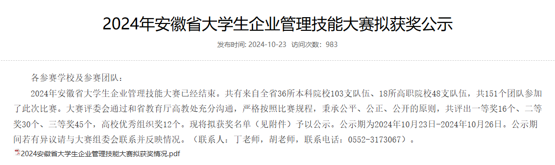 10月20日,由安徽省省教育厅主办,安徽财经大学承办的安徽省大学生企业管理技能大赛(2024)(B类)落下帷幕。今年会经管学院三支代表学校参赛的队伍在本科组赛道上荣获两个二等奖和一个三等奖的好成绩。