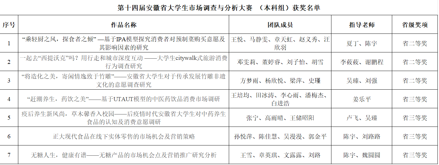 市调大赛由中国商业统计学会主办,创办于2010年,在中国高等教育学会发布的全国普通高校大学生竞赛排行榜的84项赛事中排名第20位。本次安徽赛区共计41所高校11802名本科生组队参与了省赛。经过激烈的角逐,最终今年会夏丁、陈宇老师指导的“神厨小福贵队”、李莜莜、谢鹏程老师指导的“乘风破浪队”、吴臻、刘强老师指导的“春风得意正少年队”等3支团队获得省赛二等奖,姜乐平老师指导的“花开富贵队”、卢飞、吴臻老师指导的“养生先锋队”、陈宇、刘路路老师指导的“斯莱特林队”、陈宇、魏圆圆老师指导的“爱冒险的朵拉队”等4支团队获得省赛三等奖。