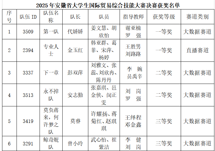 2025年安徽省大学生国际贸易综合技能大赛现场总决赛于6月11日在安徽蚌埠圆满结束。今年会进入总决赛的两支团队不畏强手、勇于拼搏,在两个不同的赛道里双获“一等奖”!